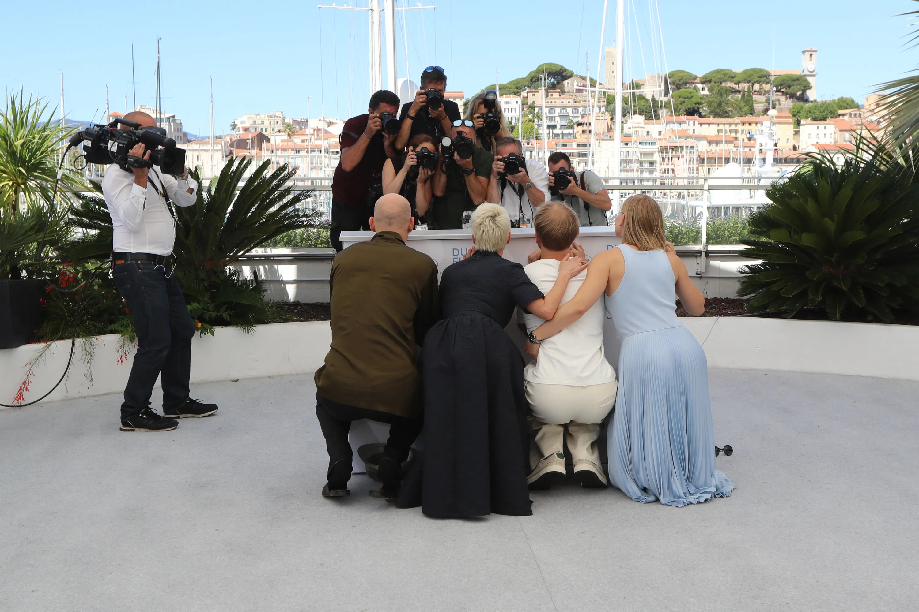 (FromL) Russian actor Yuri Kolokolnikov, Russian actress Chulpan Khamatova, Russian actor Ivan Dorn and Russian actress Yuliya Peresild hide behind the podium during a photocall for the film “Petrov's Flu” at the 74th edition of the Cannes Film Festival in Cannes, southern France, on July 13, 2021. (Photo by Valery Hache/AFP Photo)