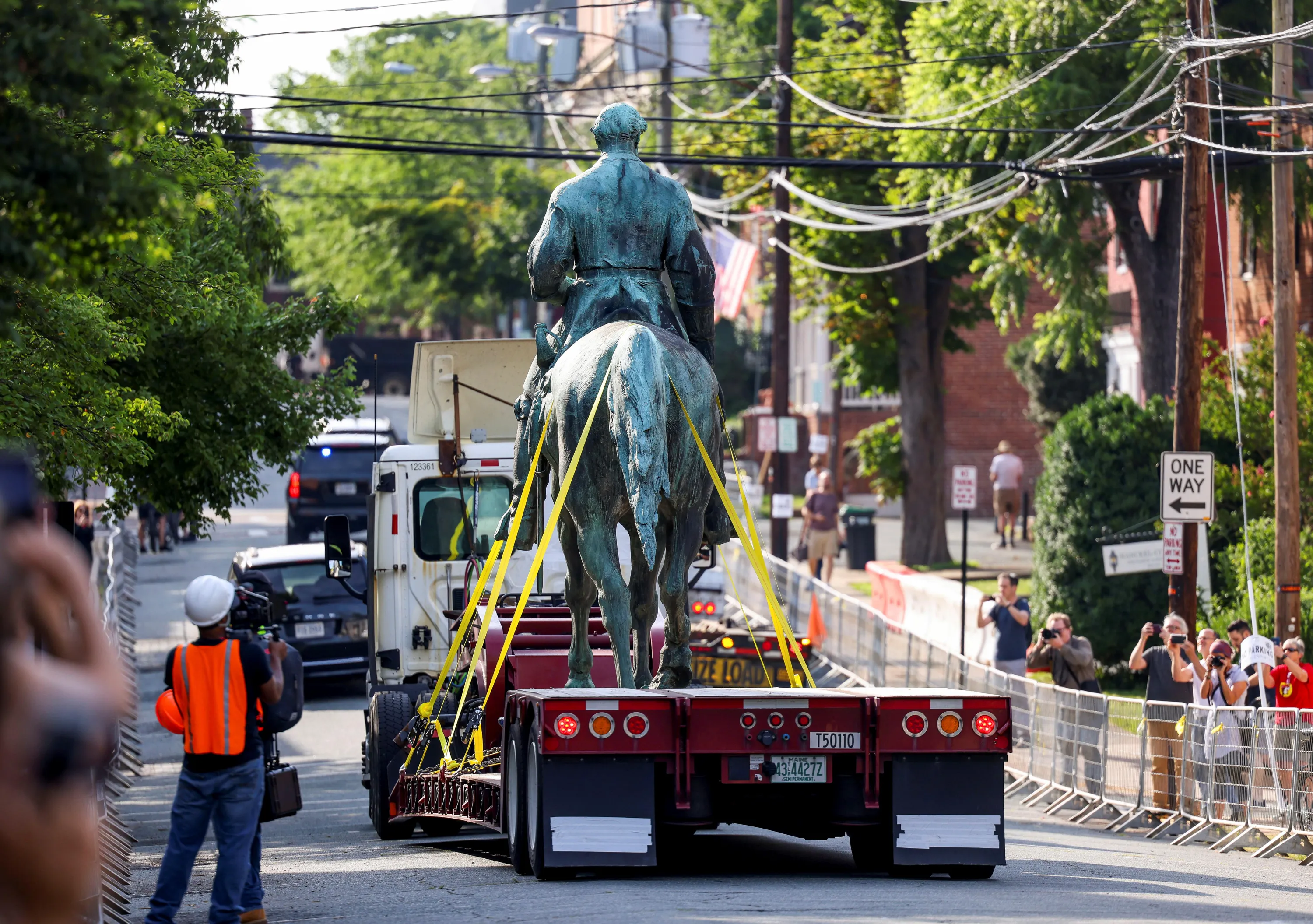 A statue of Confederate General Robert E. Lee is removed after years of legal battle over the monument, in Charlottesville, Virginia, July 10, 2021. Statues of Confederate Generals Robert E. Lee and Thomas “Stonewall” Jackson were taken down in Charlottesville, Virginia, nearly four years after white supremacist protests over plans to remove it led to clashes in which a woman was run down by a driver and killed. (Photo by Evelyn Hockstein/Reuters)