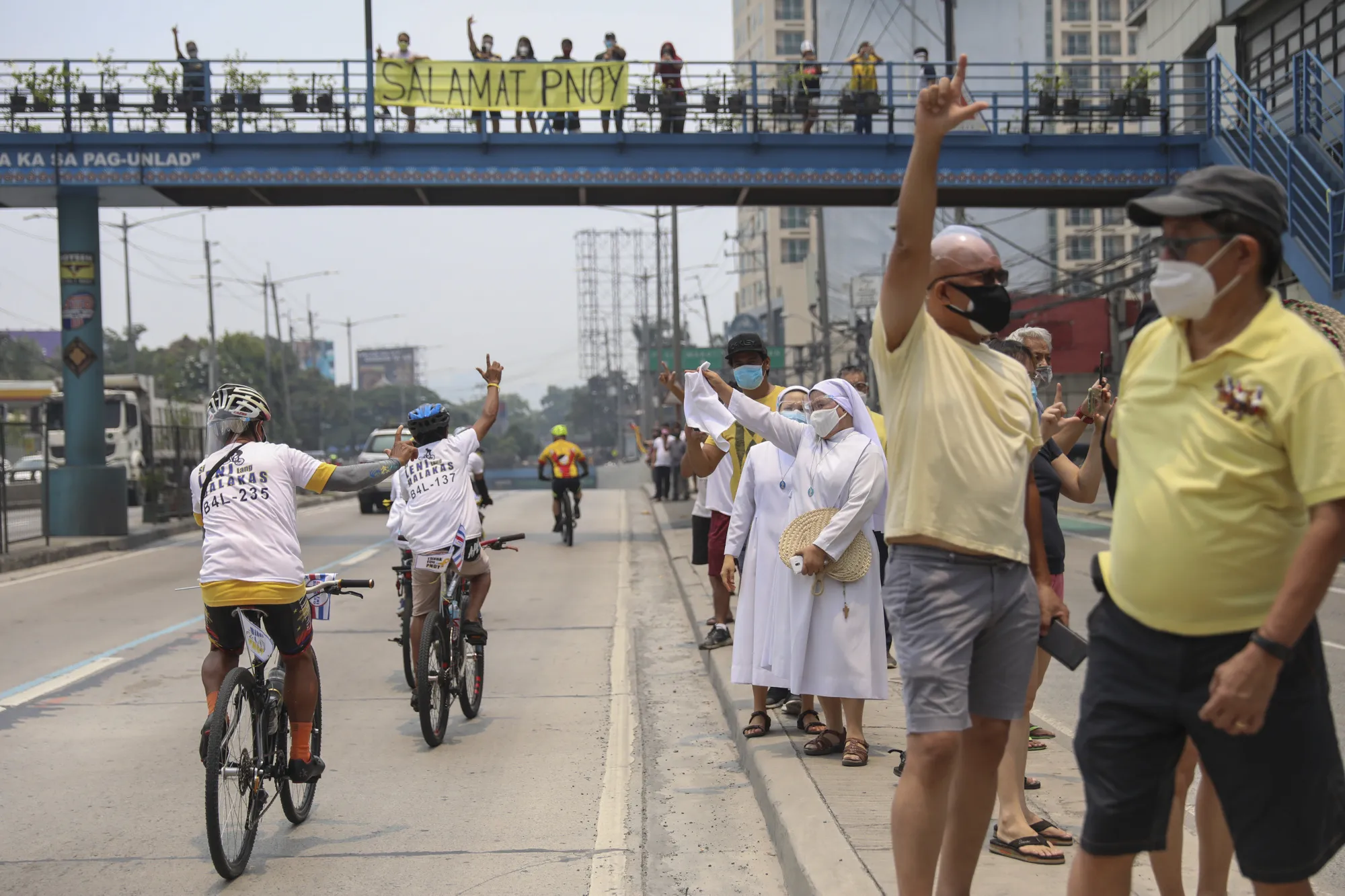 Supporters of former Philippine President Benigno Aquino III flash the “L” sign meaning “Fight!” during a motorcade before his burial in Quezon City, Philippines on Saturday, June 26, 2021. (Photo by Basilio Sepe/AP Photo)
