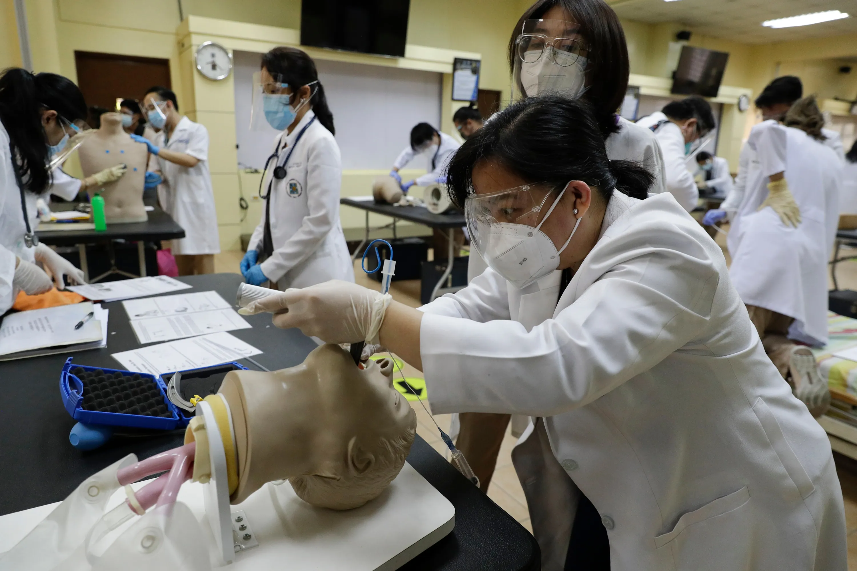 Dr. Flordeluna Mesina demonstrates an endotracheal intubation on a dummy on the second day of limited face-to-face classes at the University of Santo Tomas in Manila, Philippines on Thursday, June 10, 2021. (Photo by Aaron Favila/AP Photo)
