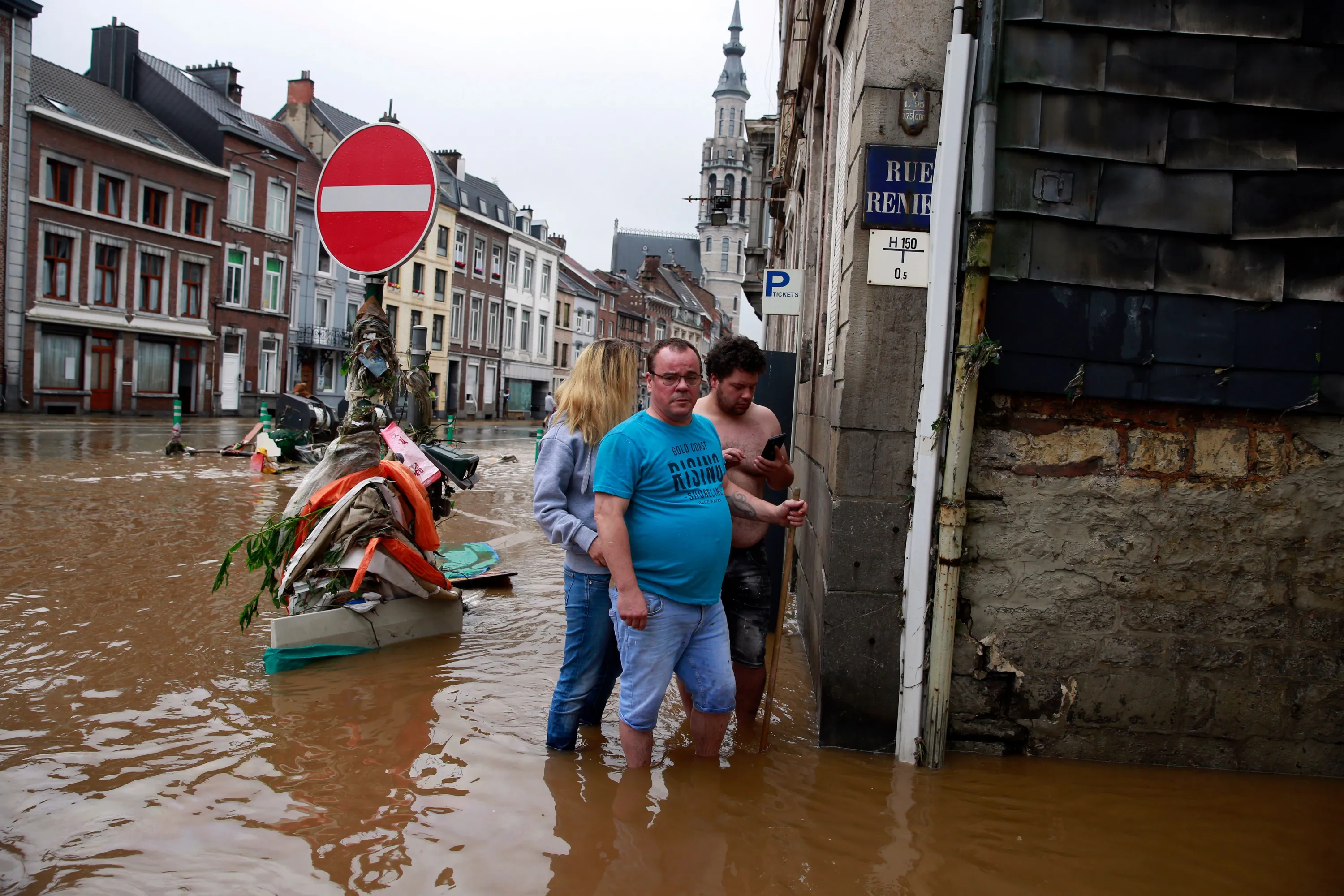 Residents make their way along a flooded street after heavy rains in Ensival, Verviers, Belgium, 15 July 2021. Heavy rains have caused widespread damage and flooding in parts of Belgium. (Photo by Stephanie Lecocq/EPA/EFE/Rex Features/Shutterstock)