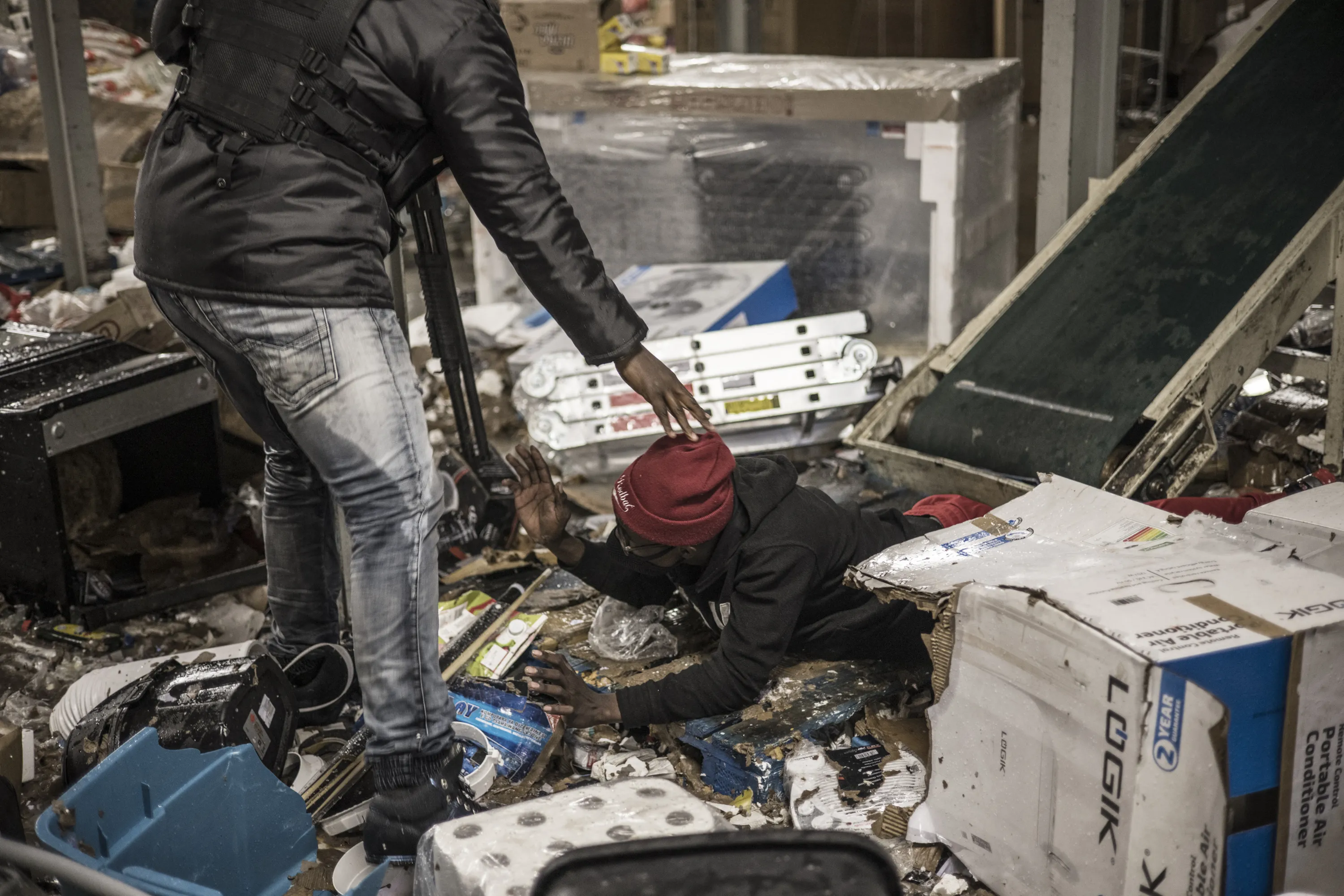 A suspected looter pleads with an armed private security officer as he is detained, inside a flooded mall in Vosloorus, on July 13, 2021. Stores in two South African provinces were ransacked for a fifth consecutive day, hours after President Cyril Ramaphosa deployed troops in a bid to quell unrest that has claimed 45 lives. The premier of Gauteng province, which includes Johannesburg, said 10 bodies were found late on July 12 at a looted shopping centre in Soweto, on the city's outskirts. (Photo by Marco Longari/AFP Photo)