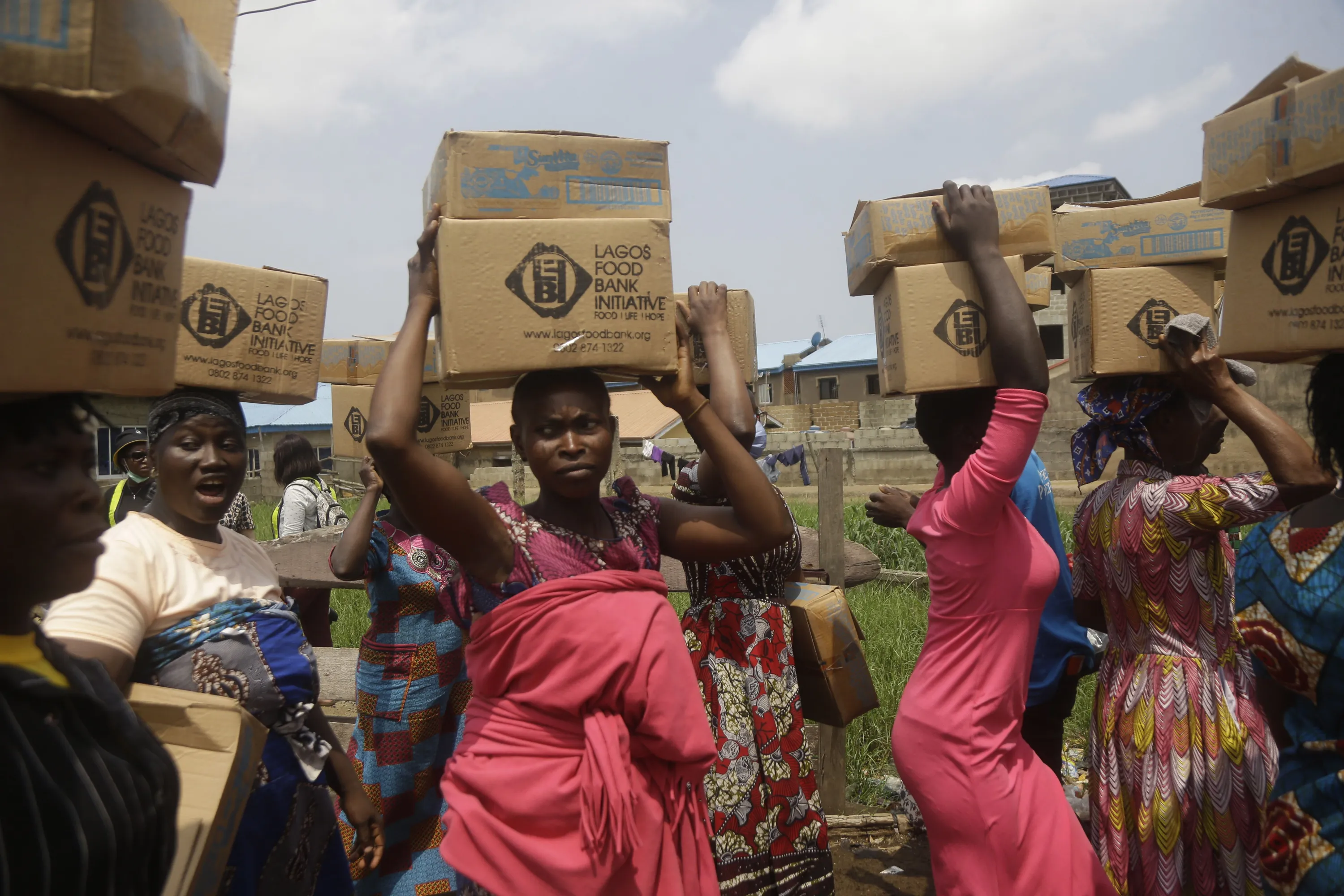 Residents of Oworonshoki Slum carry their food parcels distributed by the Lagos Food Bank Initiative, a non-profit nutrition focused initiative committed to fighting hunger and solving problems of Malnutrition for poor communities , in Lagos, Nigeria, Saturday, July 10, 2021. (Photo by Sunday Alamba/AP Photo)