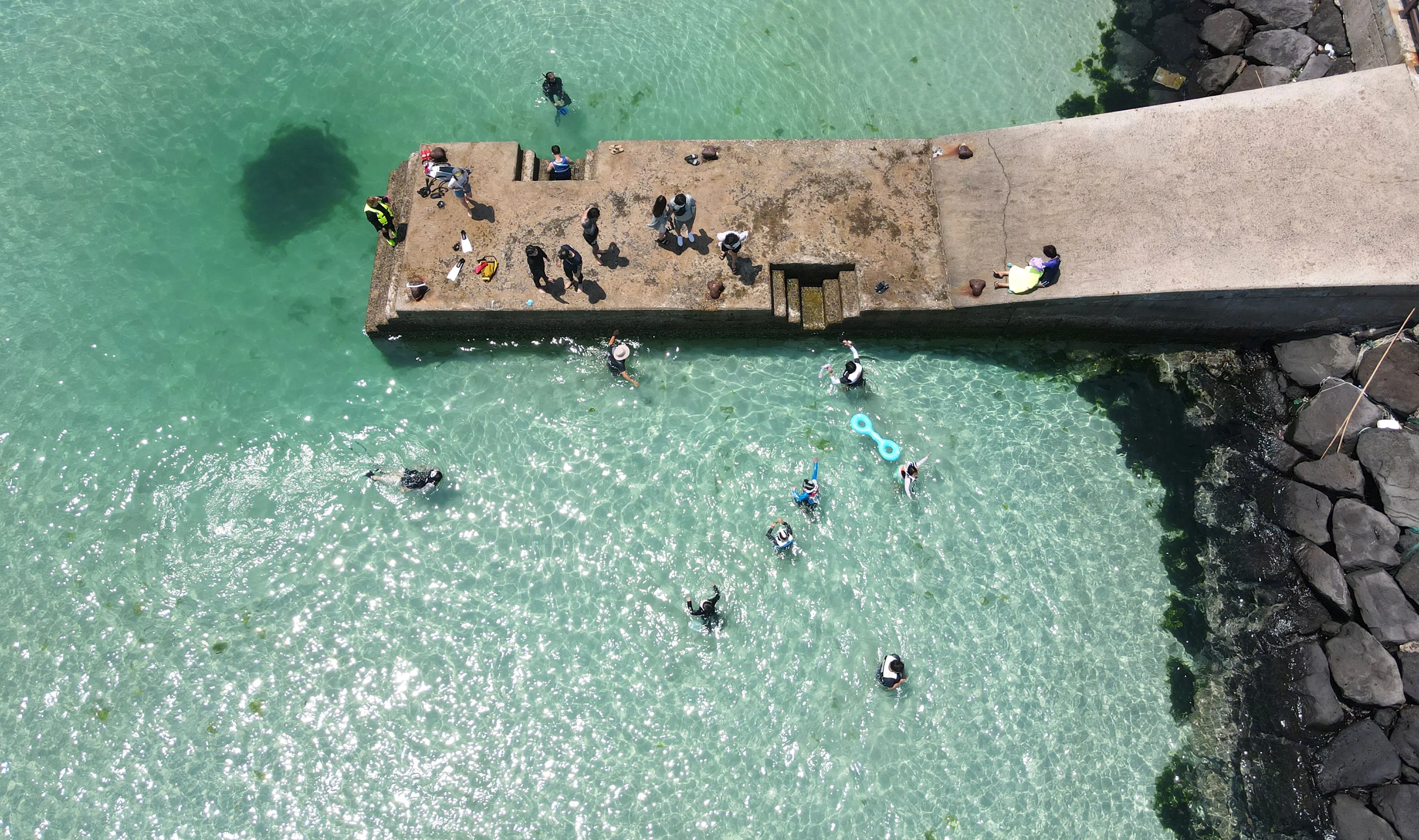 Tourists snorkel in waters near a port in the city of Jeju, on South Korea's largest island of the same name, 07 June 2021. (Photo by Yonhap/EPA/EFE)
