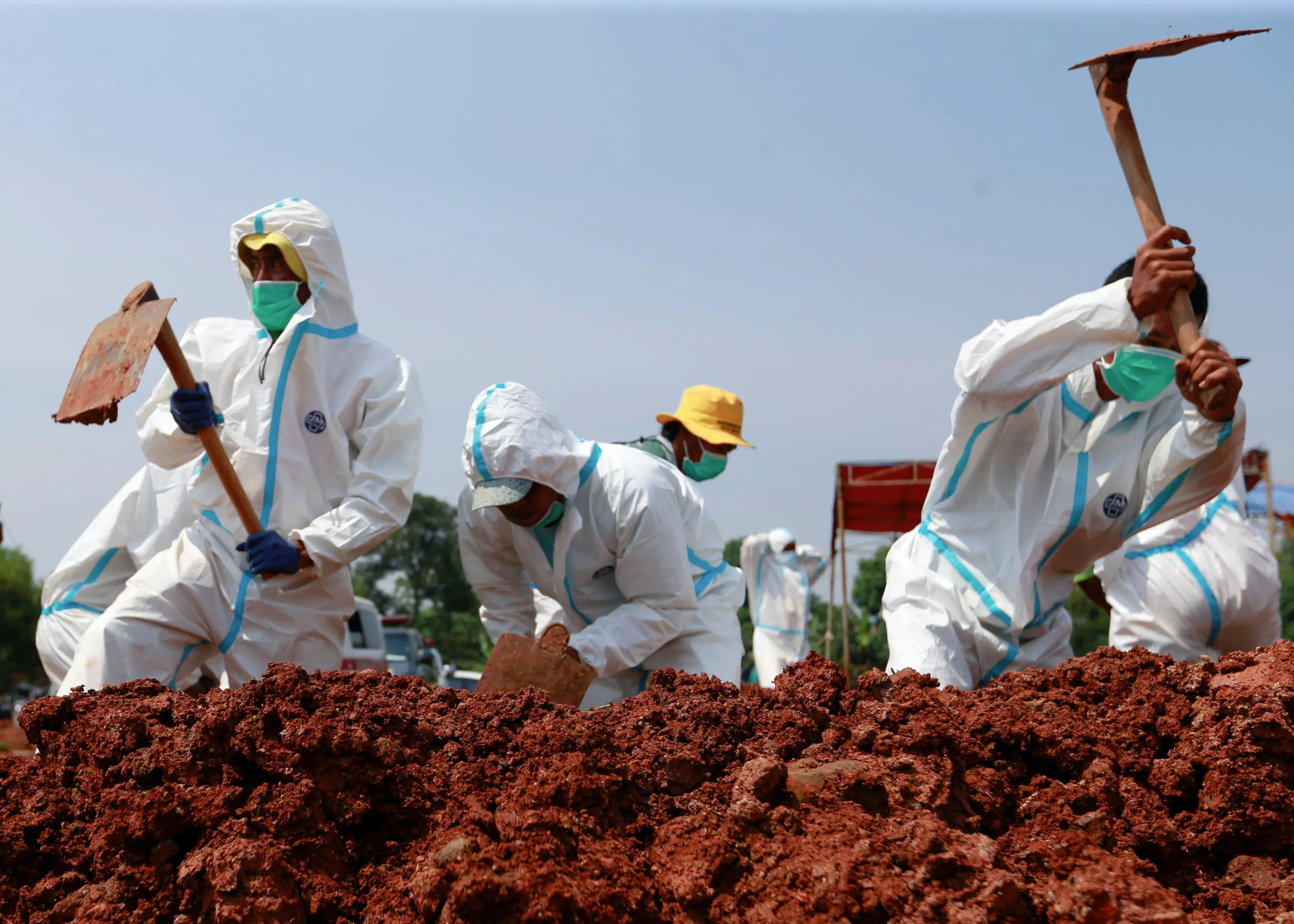 Gravediggers wearing personal protective equipment (PPE) bury a coffin at a Muslim burial area provided by the government for coronavirus disease (COVID-19) victims in Bekasi, on the outskirts of Jakarta, Indonesia, July 8, 2021. (Photo by Ajeng Dinar Ulfiana/Reuters)