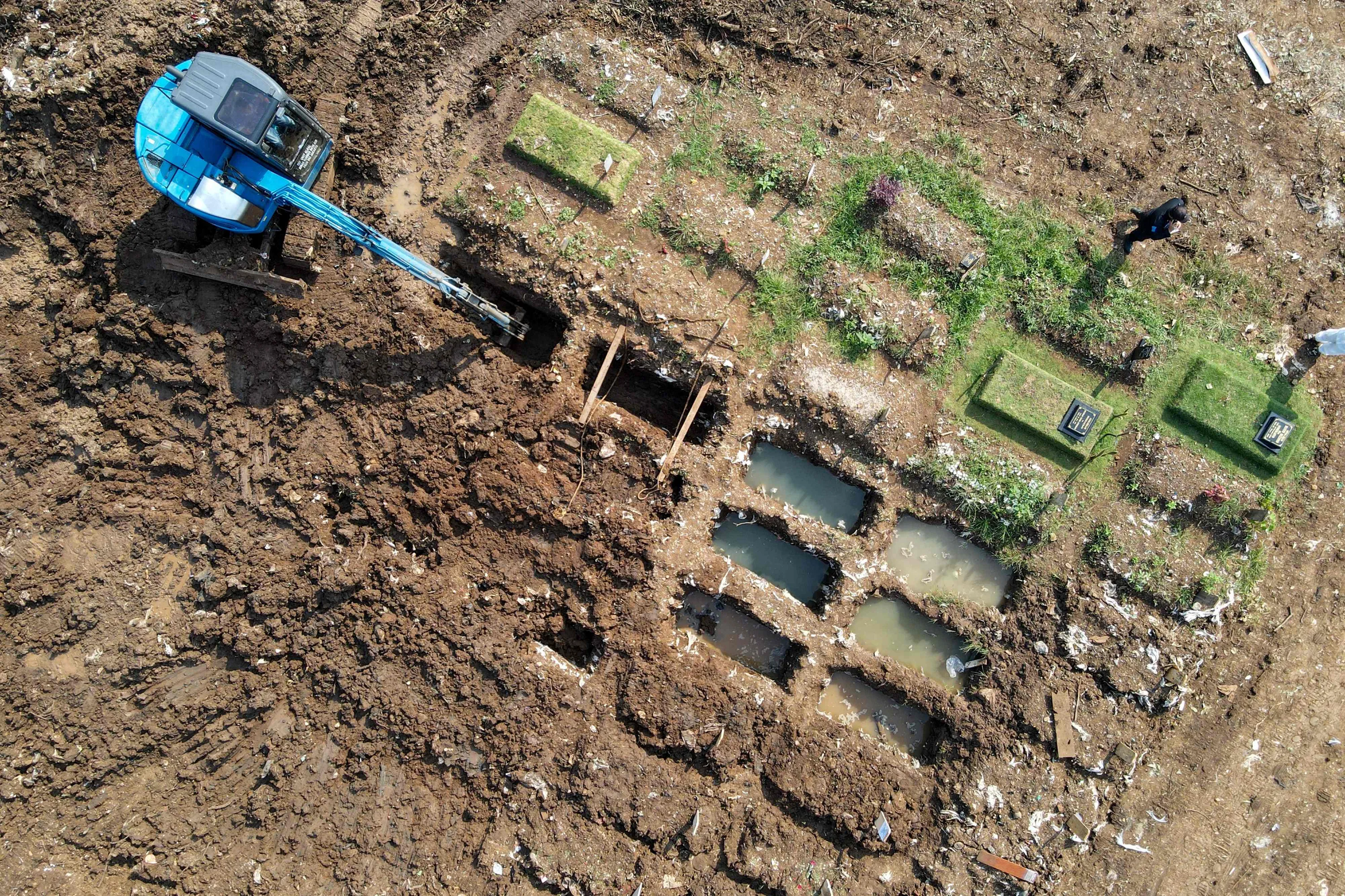 This aerial picture shows a gravesite for victims of the COVID-19 coronavirus at Srengseng Sawah cemetery in Jakarta on July 2, 2021, a day before the implementation of emergency restrictions on community activities from July 3 to 20. (Photo by Bay Ismoyo/AFP Photo)