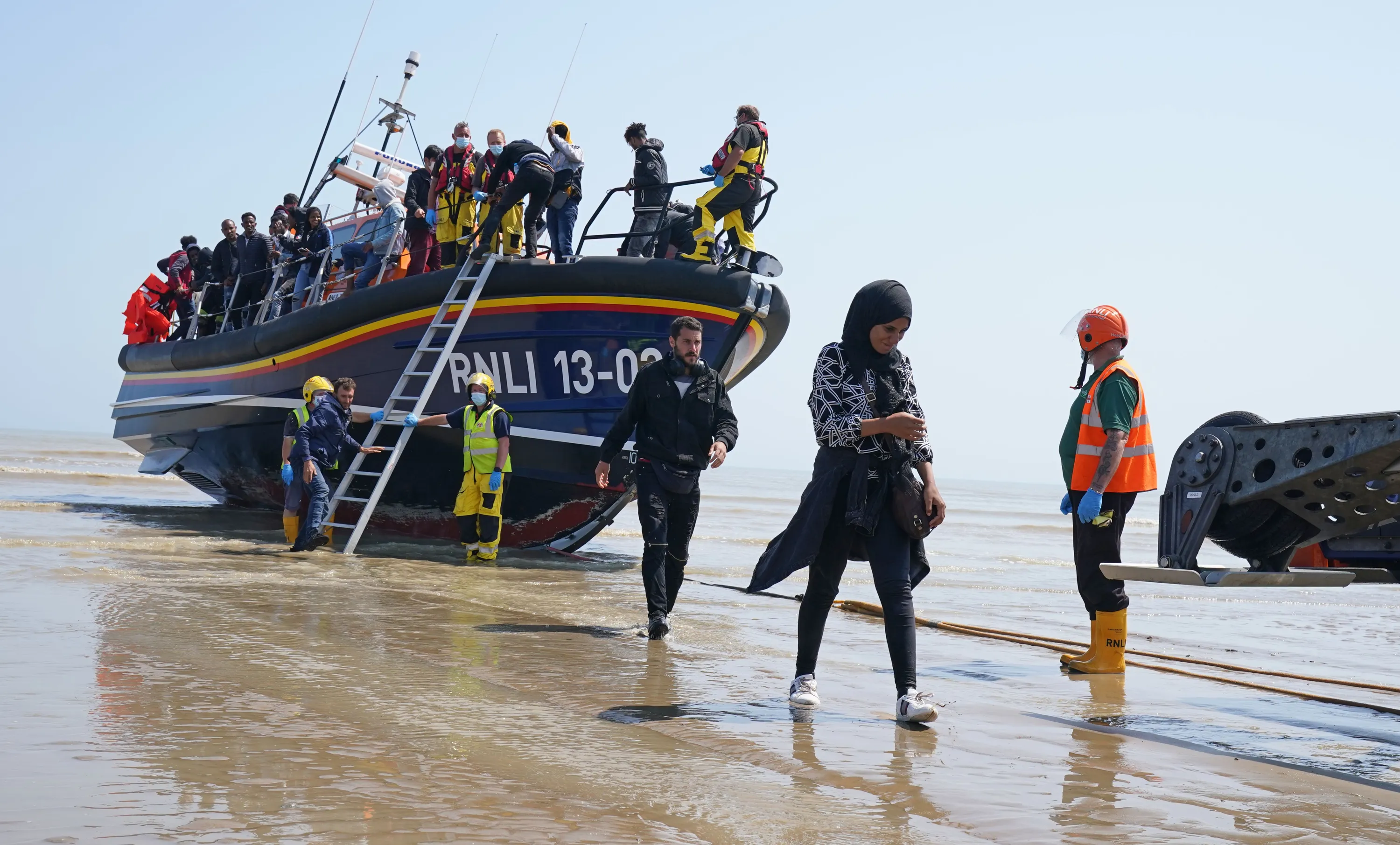A group of people thought to be migrants crossing from France come ashore from the local lifeboat at Dungeness in Kent, United Kingdom on Tuesday, July 20, 2021, after being picked-up following a small boat incident in the Channel. (Photo by Gareth Fuller/PA Images via Getty Images)