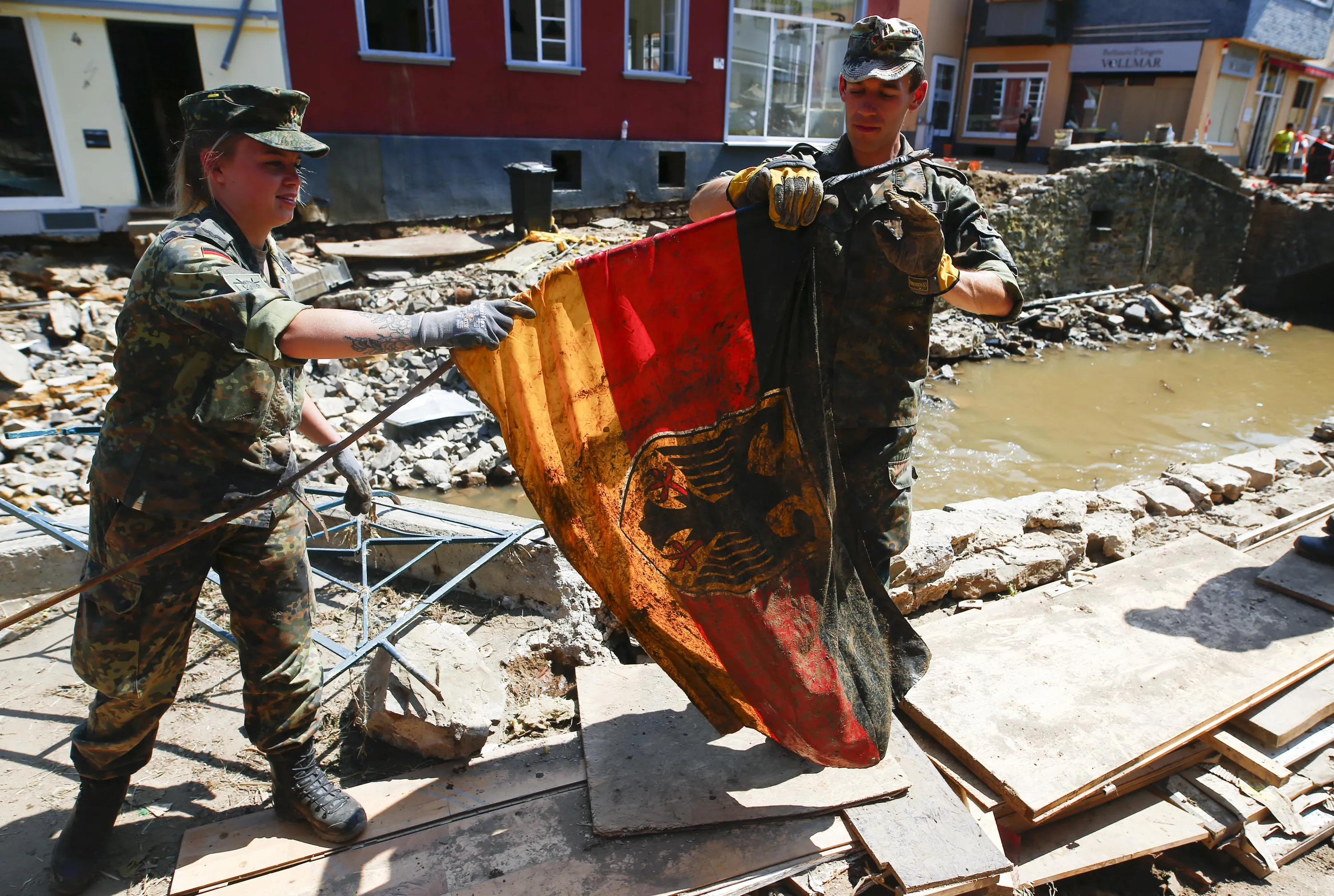 German Bundeswehr soldiers rescue a German national flag as they help to clean up following heavy rainfalls, in Bad Muenstereifel, North Rhine-Westphalia state, Germany, July 21, 2021. (Photo by Thilo Schmuelgen/Reuters)
