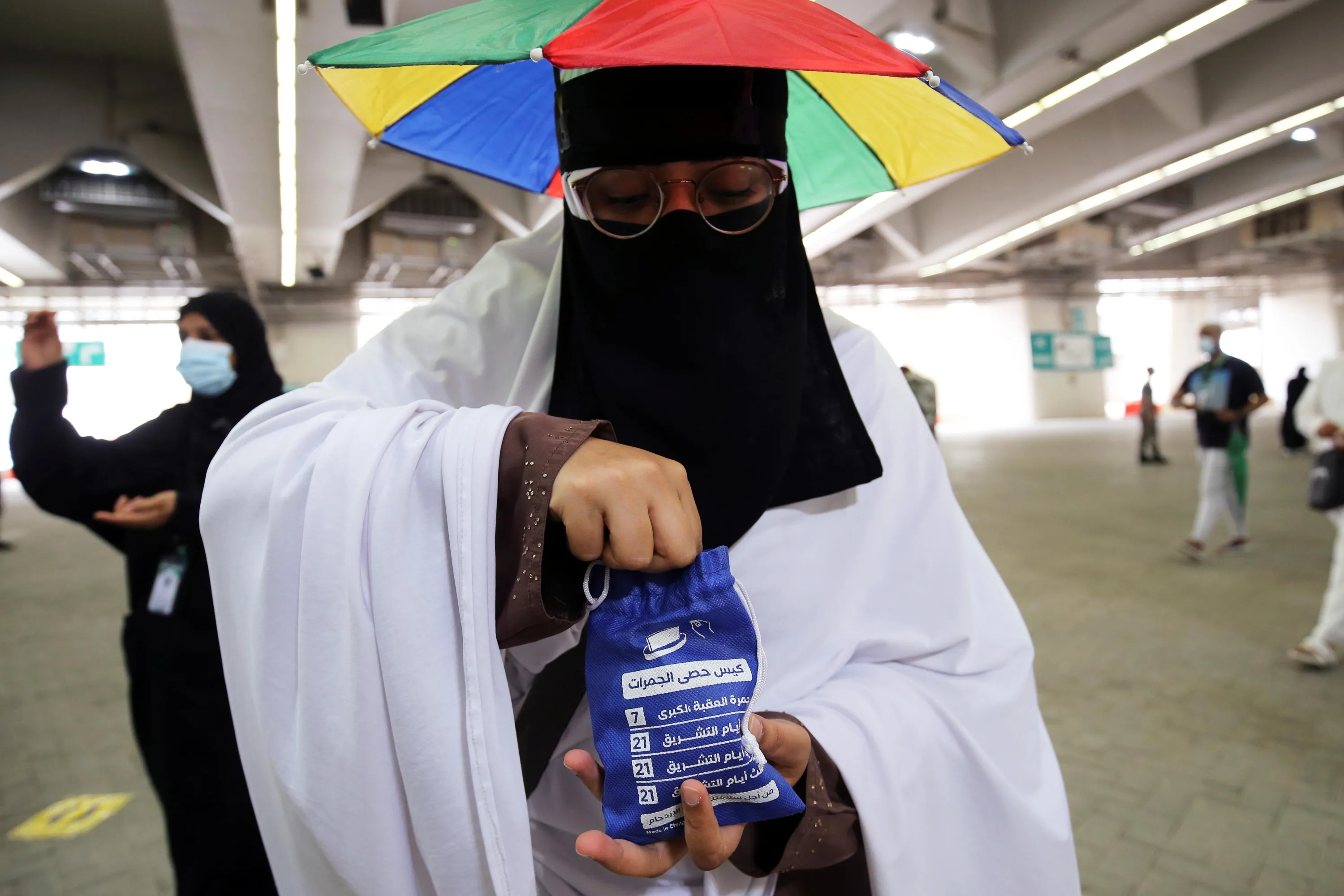 A Muslim pilgrim grabs stones to cast them at a pillar symbolizing Satan during the annual Haj pilgrimage, amid the coronavirus disease (COVID-19) pandemic, in Mina, near the holy city of Mecca, Saudi Arabia, July 21, 2021. (Photo by Ahmed Yosri/Reuters)