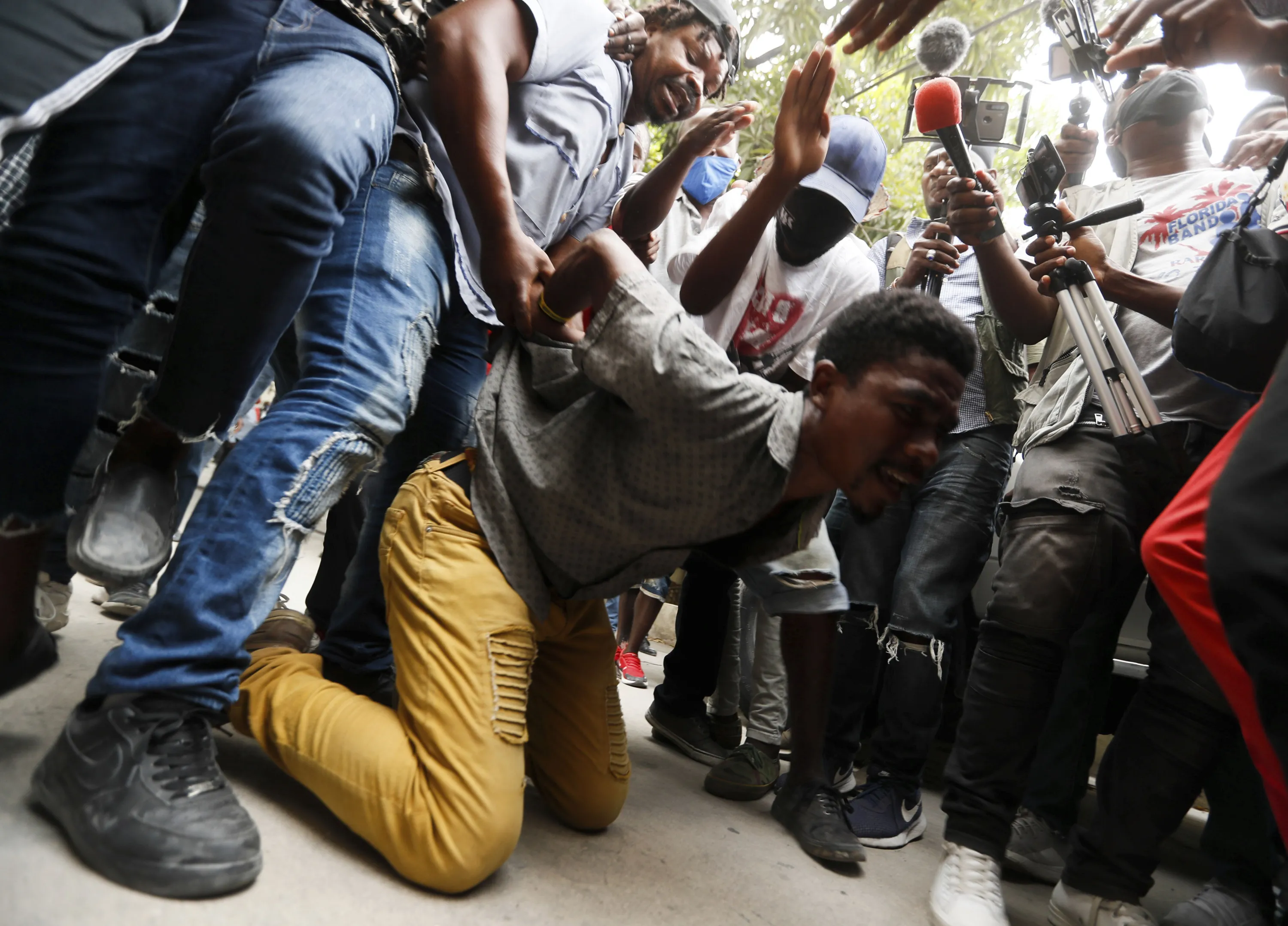 Supporters of former Senator Steven Benoit perform a mock execution for the adversaries of the senator, outside the courthouse as he departs after being called in for questioning in Port-au-Prince, Monday, July 12, 2021. (Photo by Fernando Llano/AP Photo)