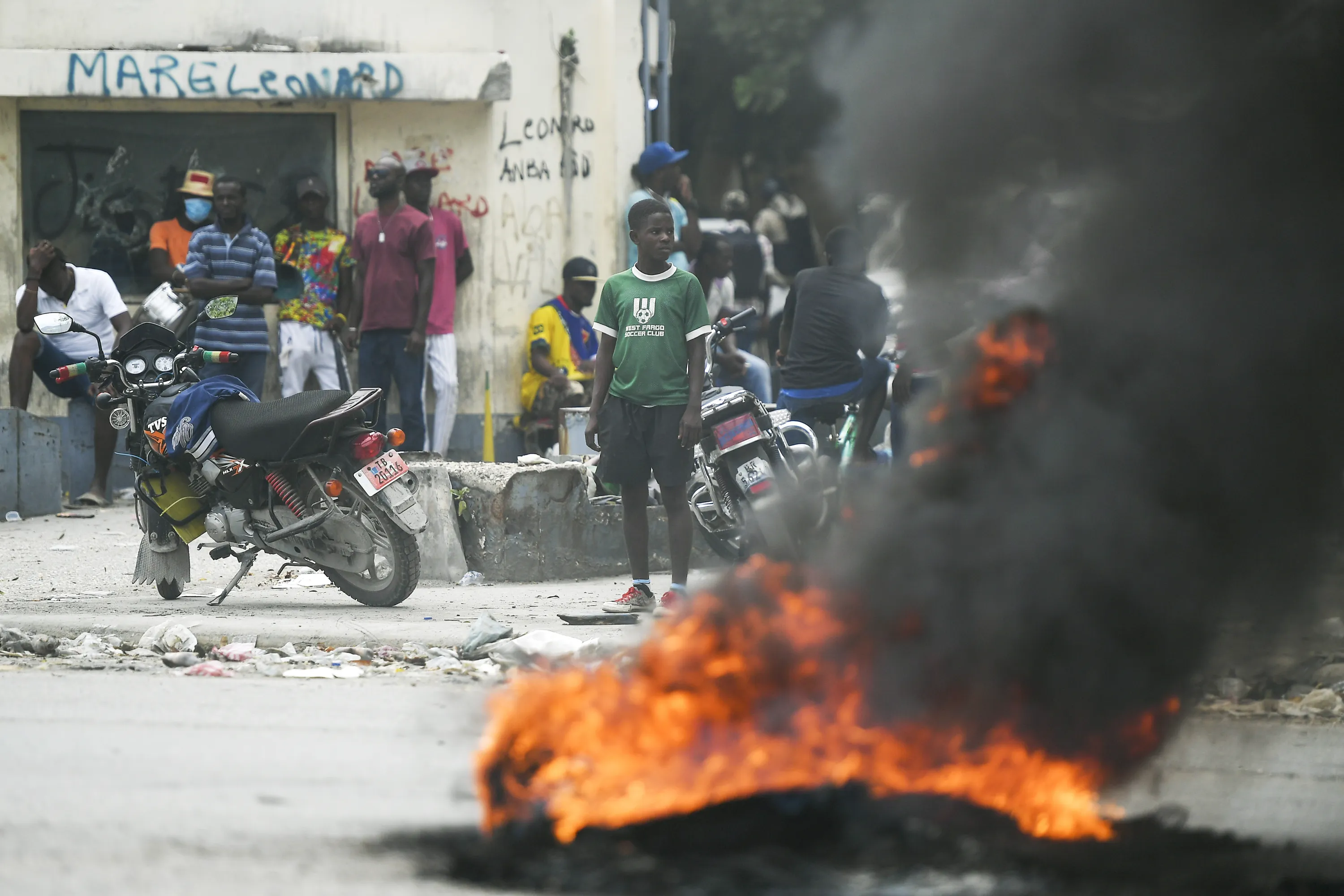 A tire set on fire by supporters of former Senators Youri Latortue and Steven Benoit outside the courthouse in Port-au-Prince, Monday, July 12, 2021. (Photo by Matias Delacroix/AP Photo)