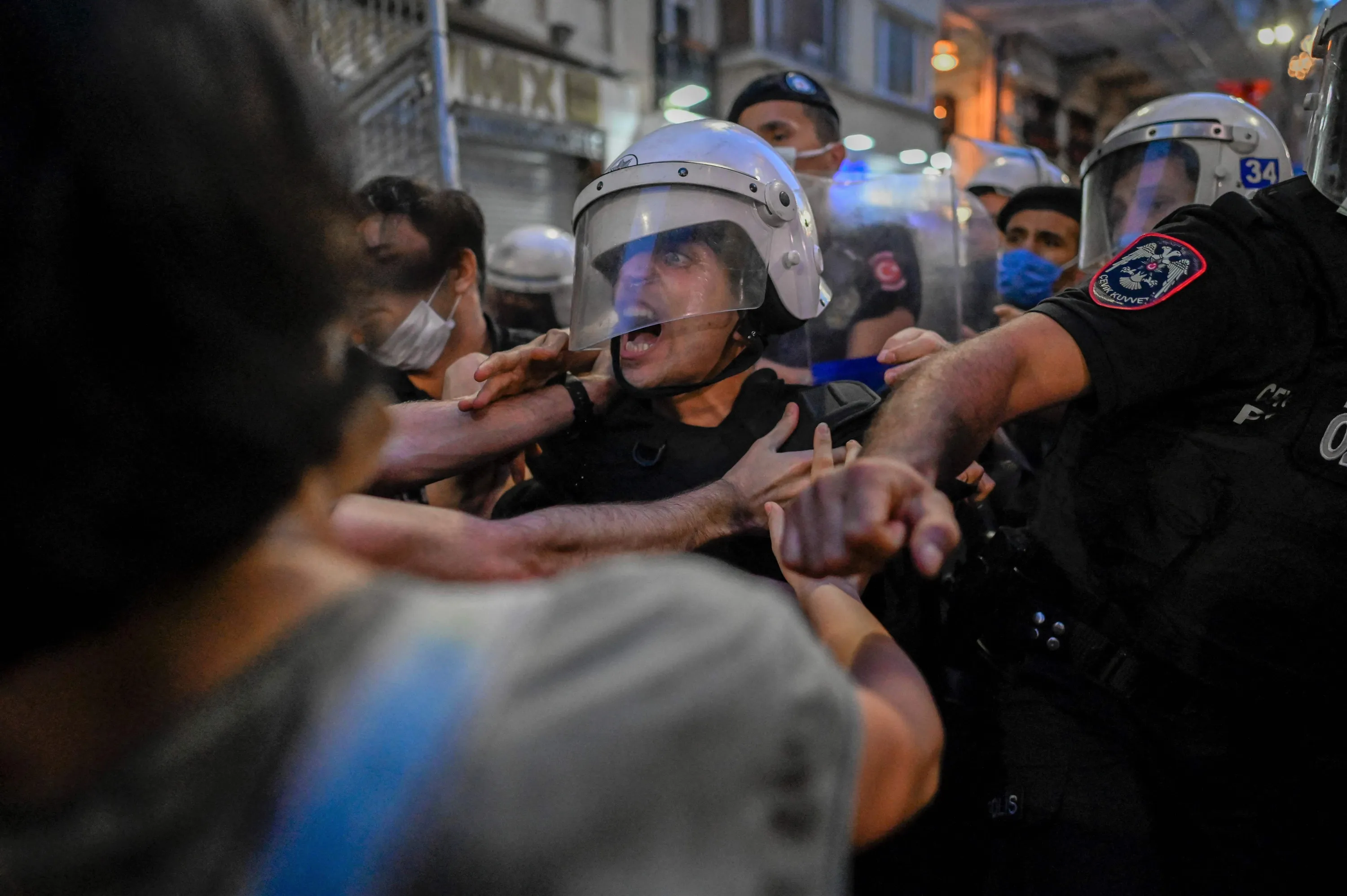 Turkish police clash with demonstrators during a protest against Turkey's decision to withdraw from the Istanbul Convention, in Istanbul, on July 1, 2021. Police fired tear gas at protesters in Istanbul demonstrating against Turkey's controversial exit on July 1, 2021 from a treaty combatting femicide and domestic abuse. Turkish President Recep Tayyip Erdogan sparked international outrage in March by pulling out of the world's first binding treaty to prevent and combat violence against women, known as the Istanbul Convention. (Photo by Bulent Kilic/AFP Photo)