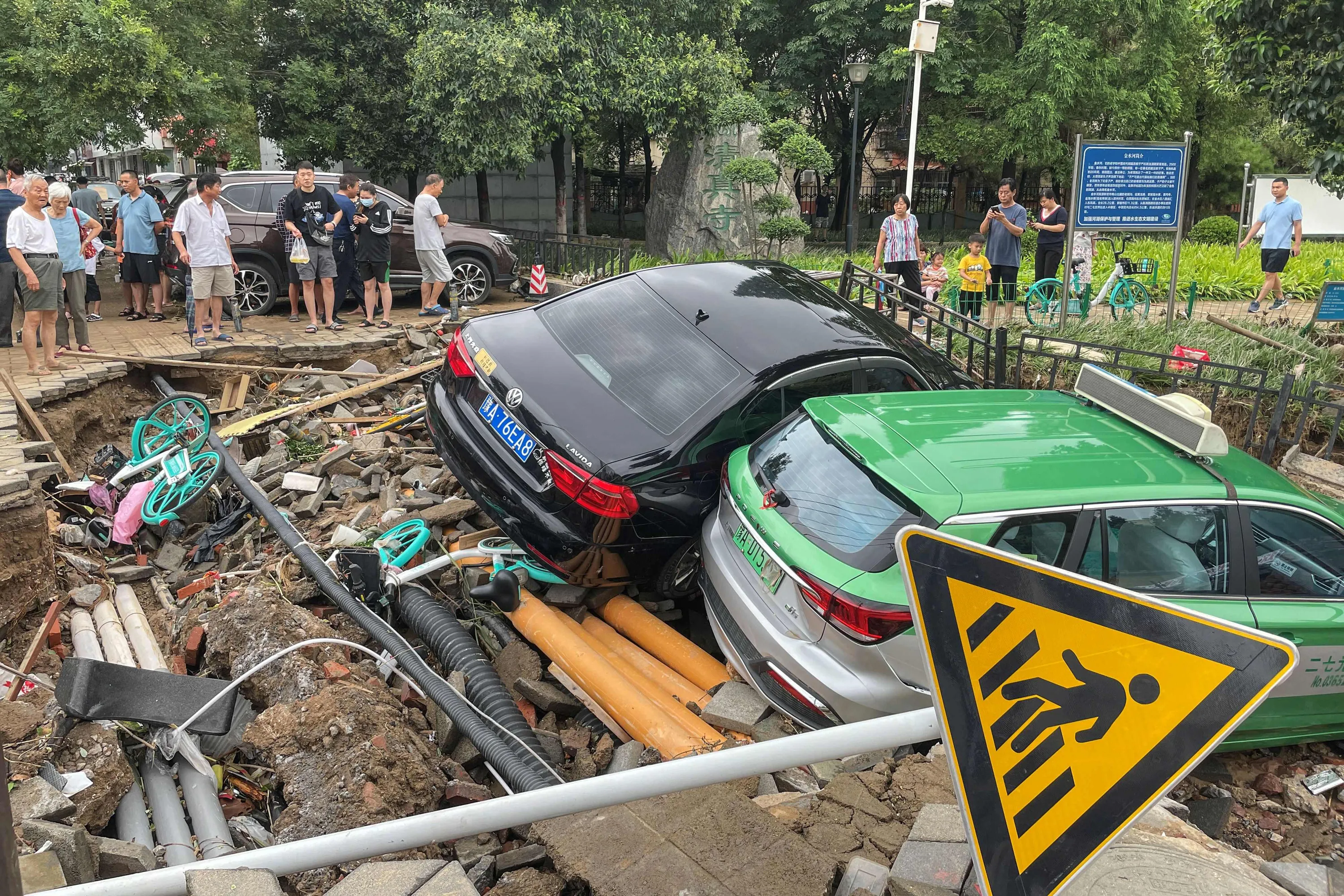 Damaged cars rest on debris after heavy rains hit the city of Zhengzhou causing floods in China's central Henan province on July 21, 2021. (Photo by AFP Photo/China Stringer Network)