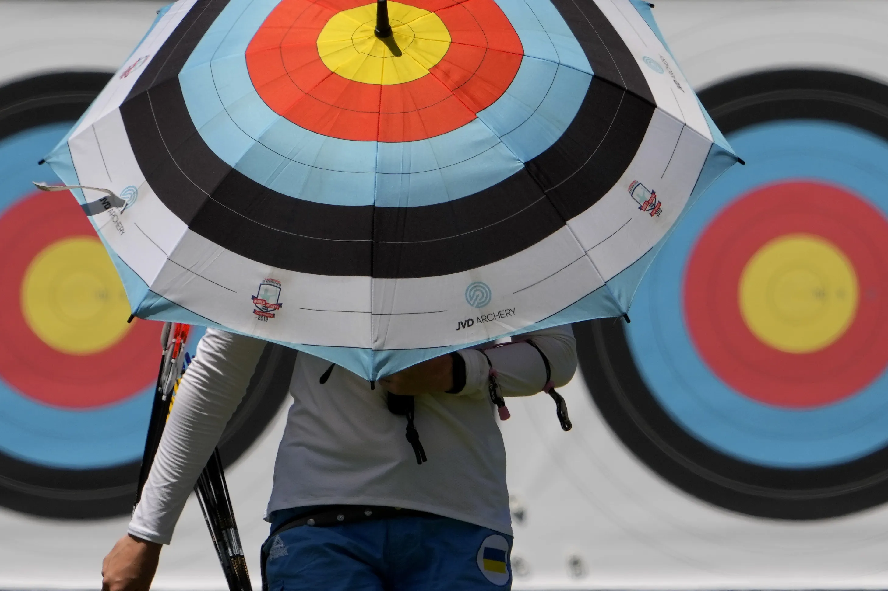 An athlete from Ukraine walks to the firing area as she practices for the 2020 Summer Olympics at Yumenoshima Park Archery Field, Sunday, July 18, 2021, in Tokyo. (Photo by Charlie Riedel/AP Photo)