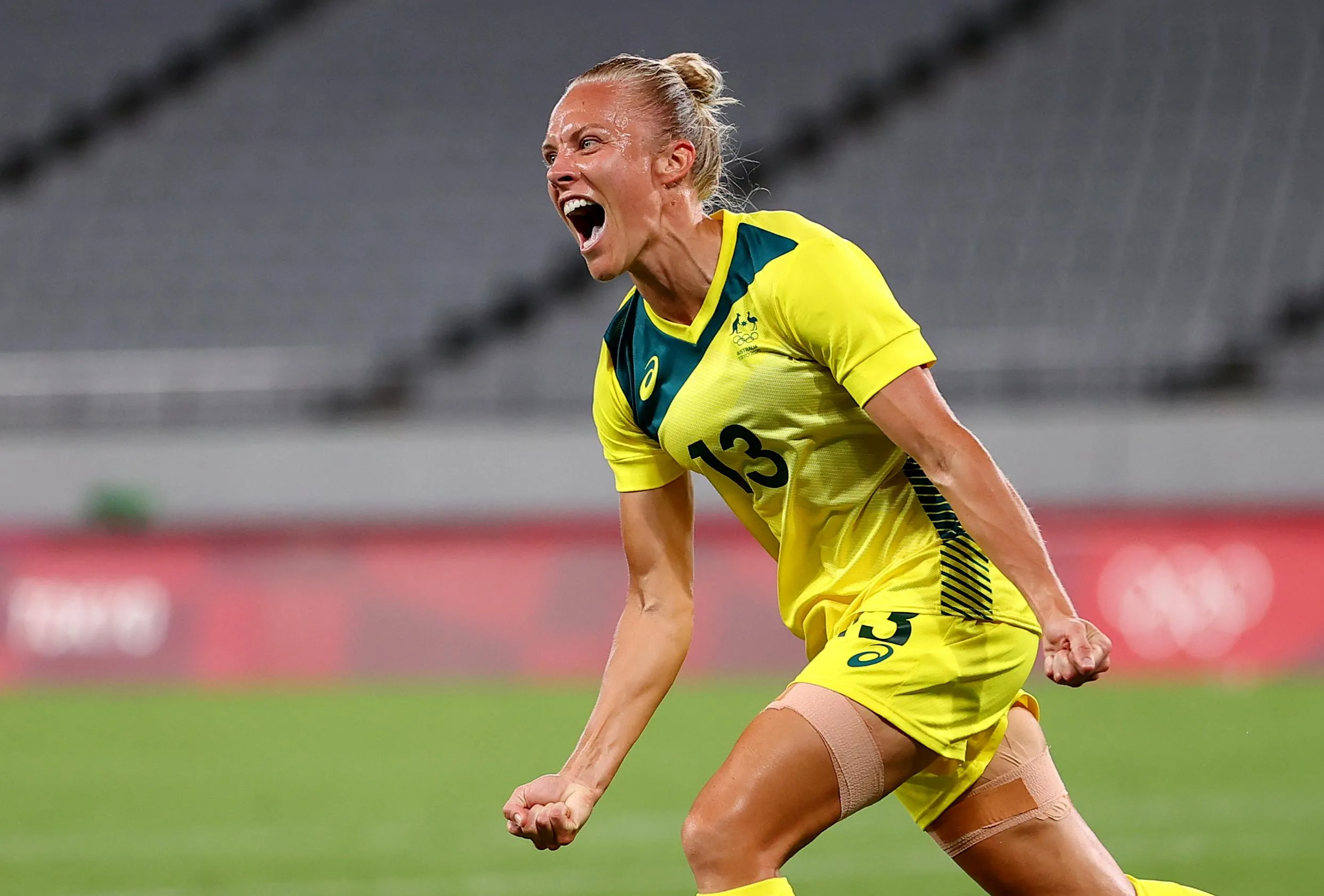 Tameka Yallop #13 of Team Australia celebrates after scoring their side's first goal during the Women's First Round Group G match between Australia and New Zealand during the Tokyo 2020 Olympic Games at Tokyo Stadium on July 21, 2021 in Chofu, Tokyo, Japan. (Photo by Edgar Su/Reuters)