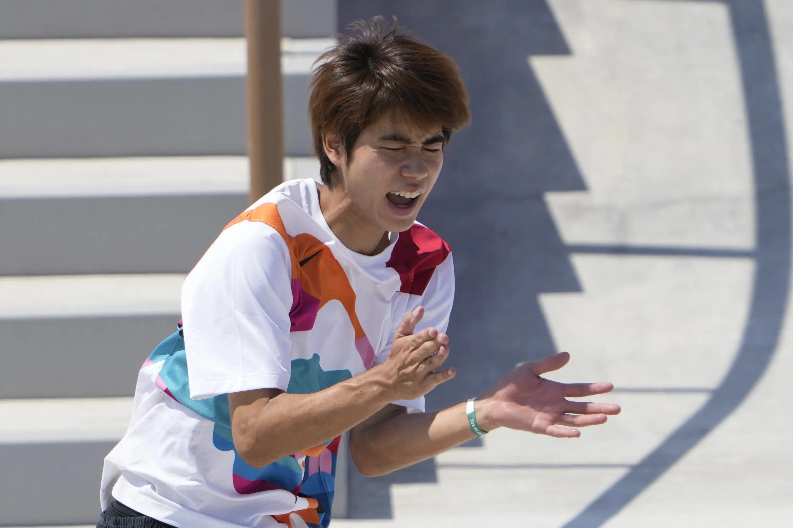 Yuto Horigome of Japan reacts after skating during the men's street skateboarding finals at the 2020 Summer Olympics, Sunday, July 25, 2021, in Tokyo, Japan. (Photo by Jae C. Hong/AP Photo)
