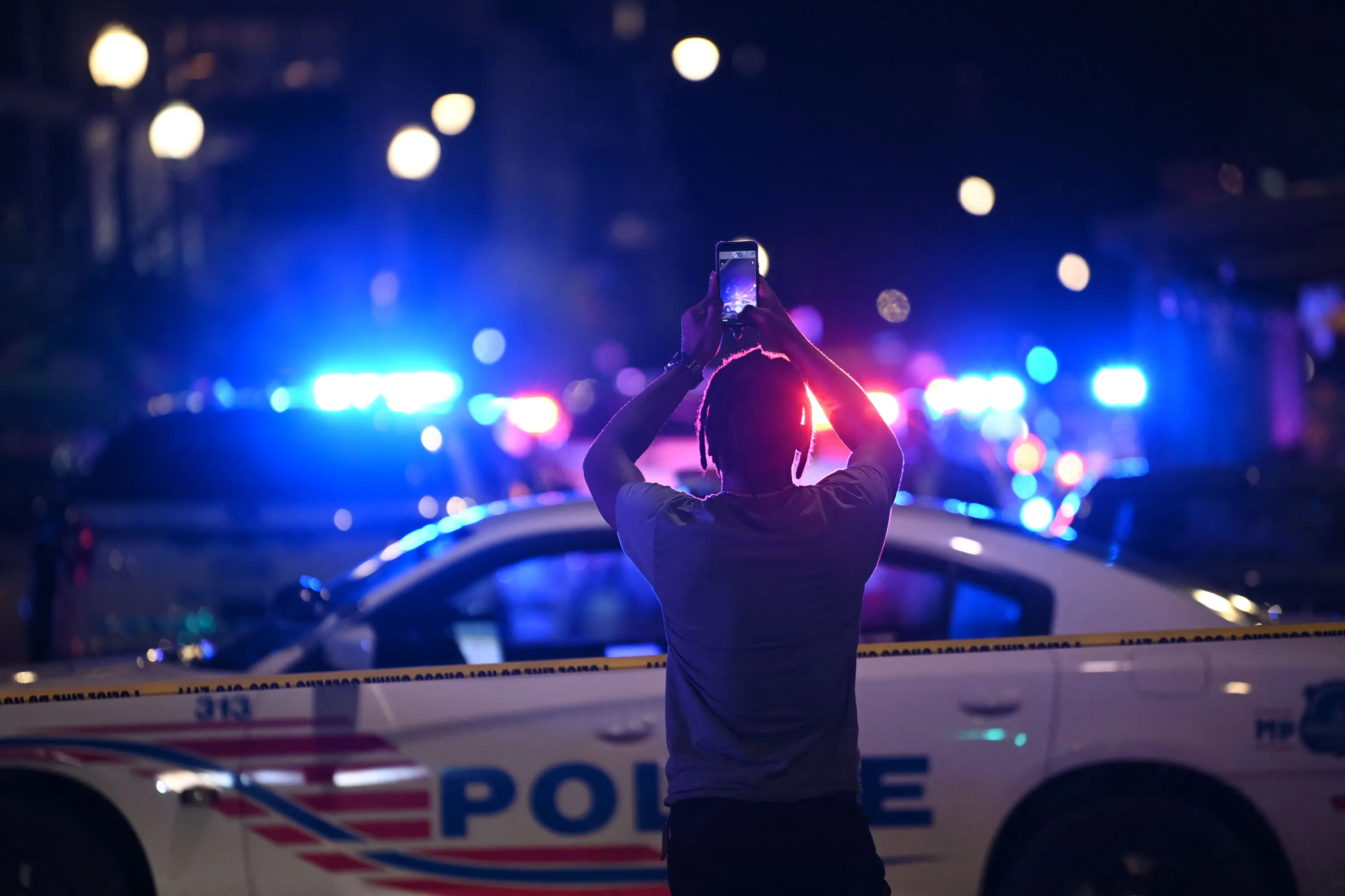 A man uses his phone in front of police cars blocking a street after a shooting at a restaurant in Washington, DC, on July 22, 2021. (Photo by Brendan Smialowski/AFP Photo)