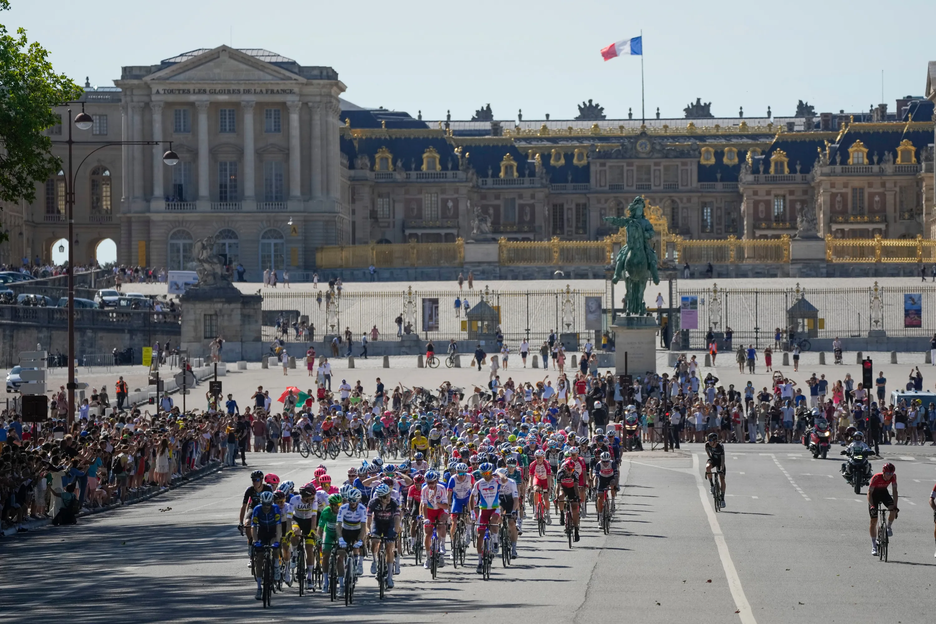 The pack passes the Palace of Versailles during the twenty-first and last stage of the Tour de France cycling race over 108.4 kilometers (67.4 miles) with start in Chatou and finish on the Champs Elysees in Paris, France,Sunday, July 18, 2021. (Photo by Daniel Cole/AP Photo)