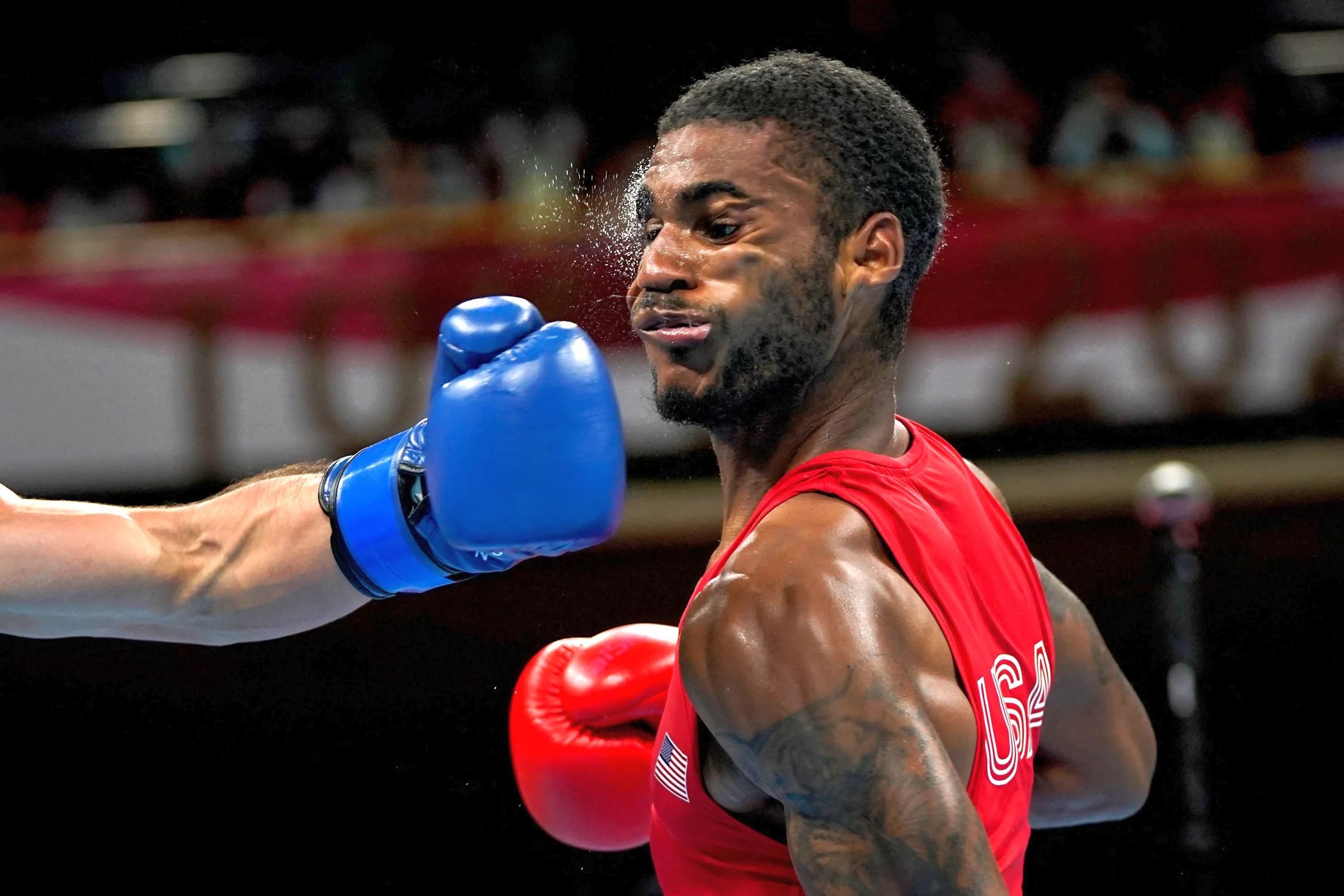 USA's Delante Marquis Johnson (red) takes a punch from Argentina's Brian Agustin Arregui during their men's welter (63-69kg) preliminaries boxing match during the Tokyo 2020 Olympic Games at the Kokugikan Arena in Tokyo on July 24, 2021. (Photo by Frank Franklin II/Pool via AFP Photo)