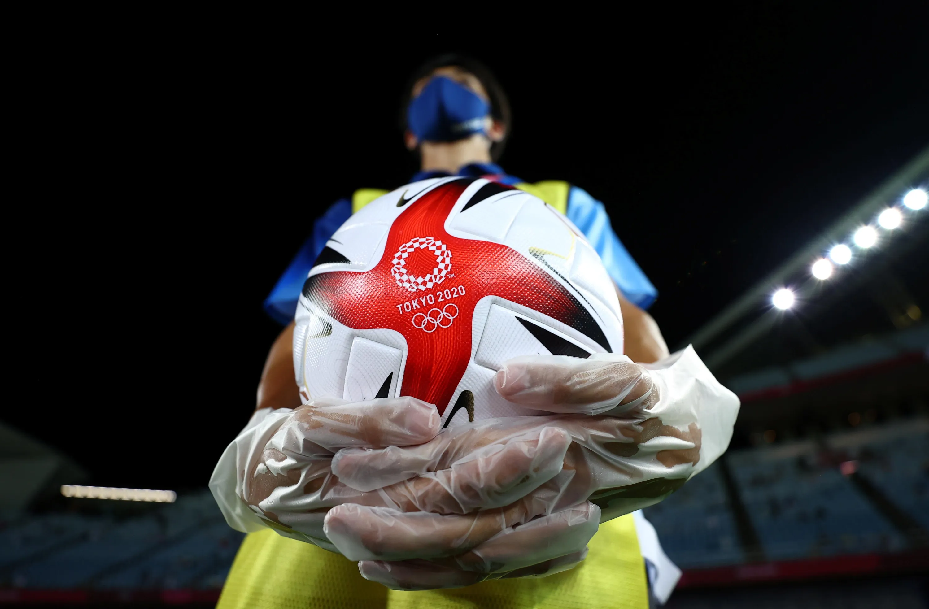 Member of staff wearing Personal Protective Equipment (PPE) holds a ball before the match Netherlands v Brazil in Miyagi Stadium, Miyagi, Japan on July 24, 2021. (Photo by Amr Abdallah Dalsh/Reuters)