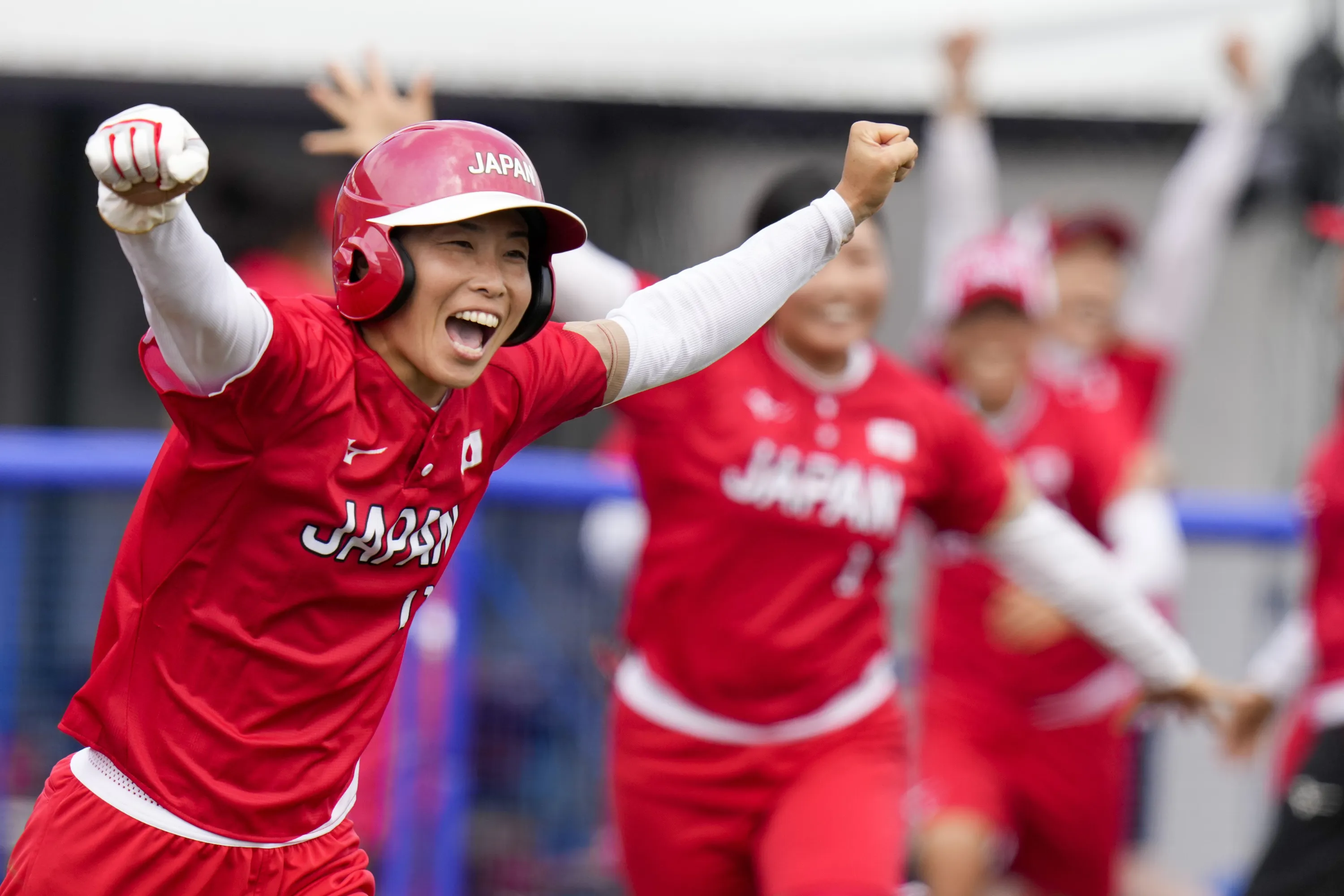 Japan's Eri Yamada celebrates their win over Mexico during their softball game at the 2020 Summer Olympics, Thursday, July 22, 2021, in Fukushima, Japan. (Photo by Jae C. Hong/AP Photo)