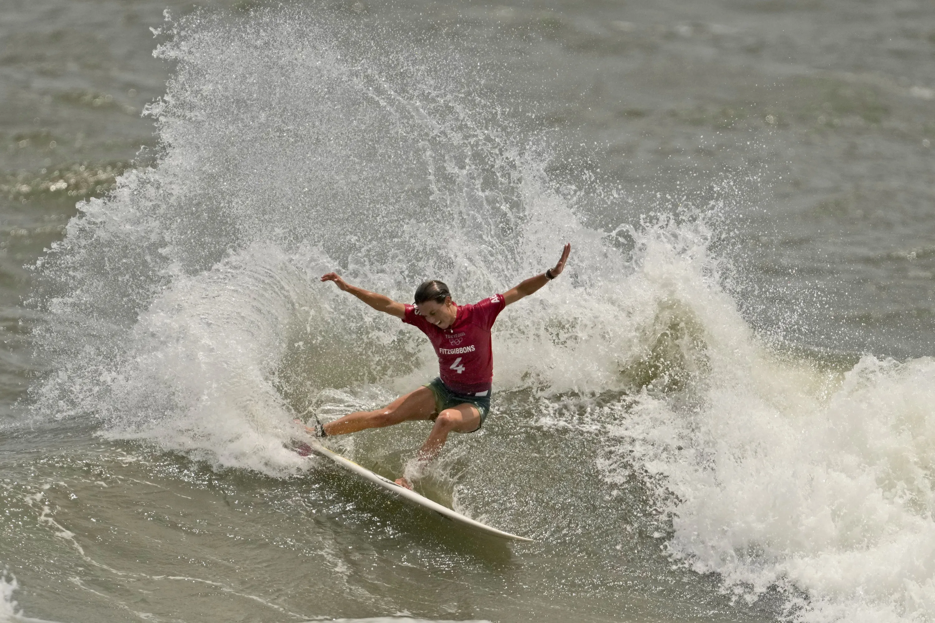 Australia's Sally Fitzgibbons maneuvers on a wave during third round of women's surfing competition at the 2020 Summer Olympics, Monday, July 26, 2021, at Tsurigasaki beach in Ichinomiya, Japan. (Photo by Francisco Seco/AP Photo)