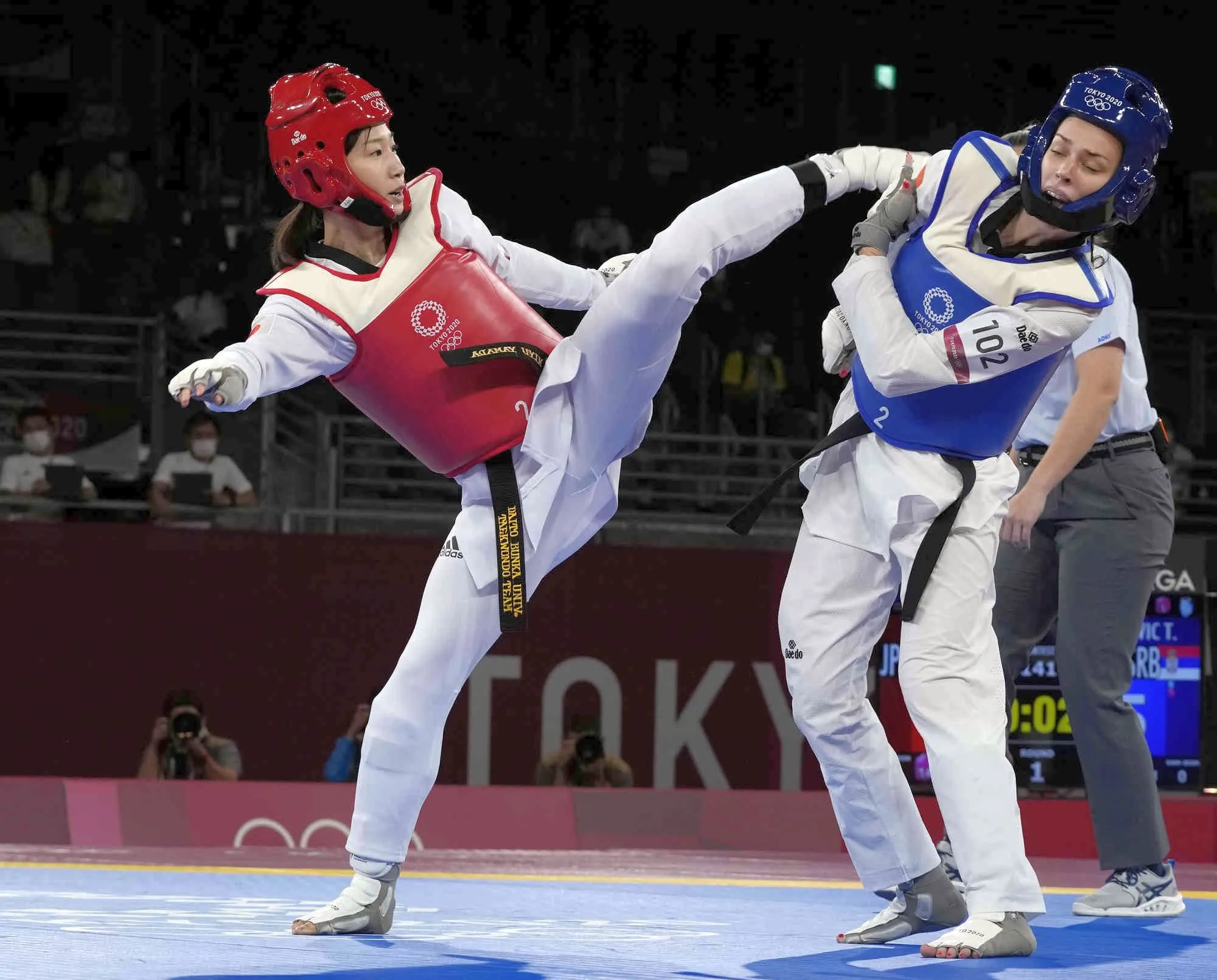 Japan Miyu Yamada, left, attacks Serbia's Tijana Bogdanović during the women's 49kg taekwondo match at the 2020 Summer Olympics, Saturday, July 24, 2021, in Tokyo, Japan. (Photo by Themba Hadebe/AP Photo)