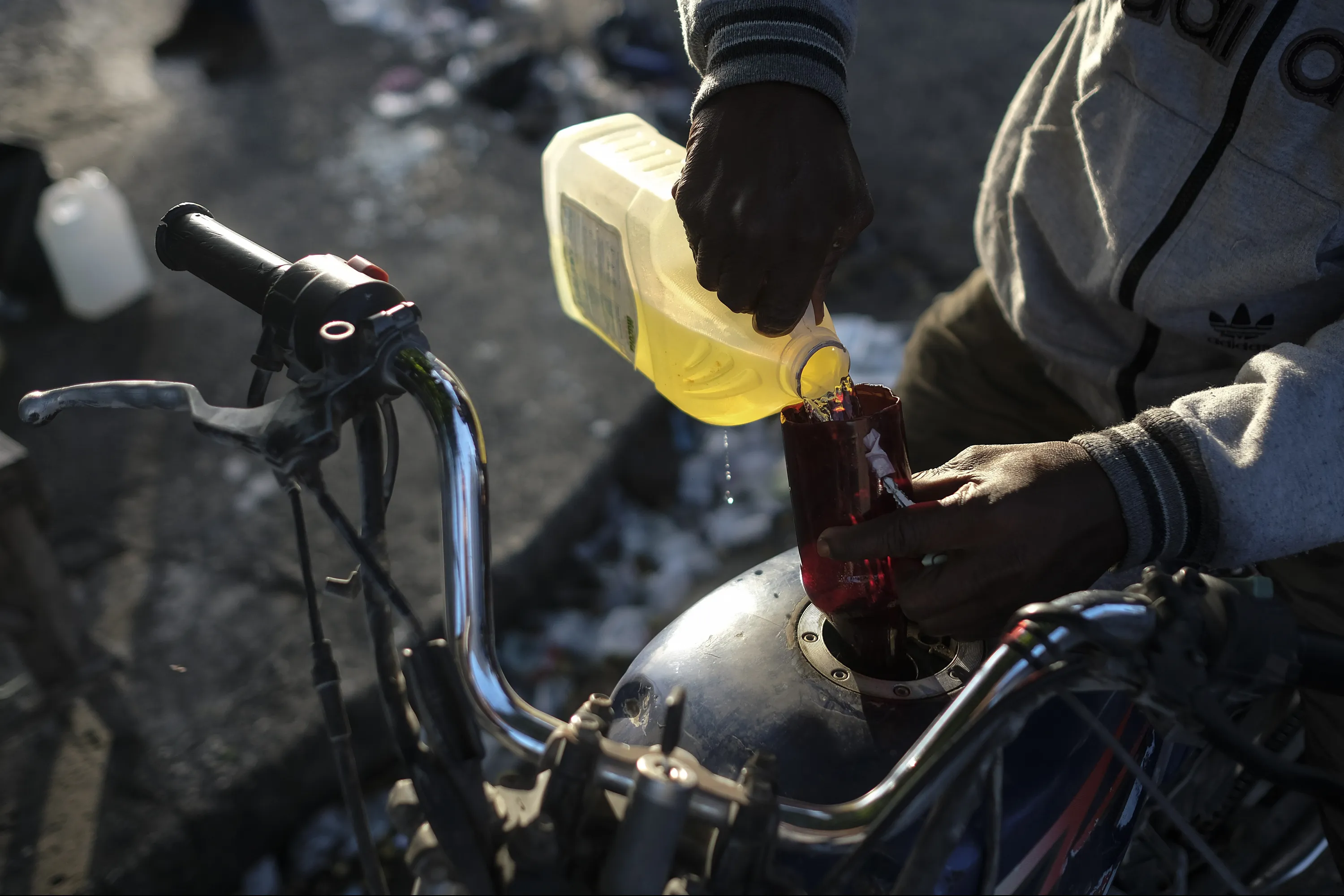 A man pours a small amount of gasoline into his motorcycle amid gas shortages in the La Saline neighborhood of Port-au-Prince, Haiti, Monday, July 19, 2021. (Photo by Matias Delacroix/AP Photo)