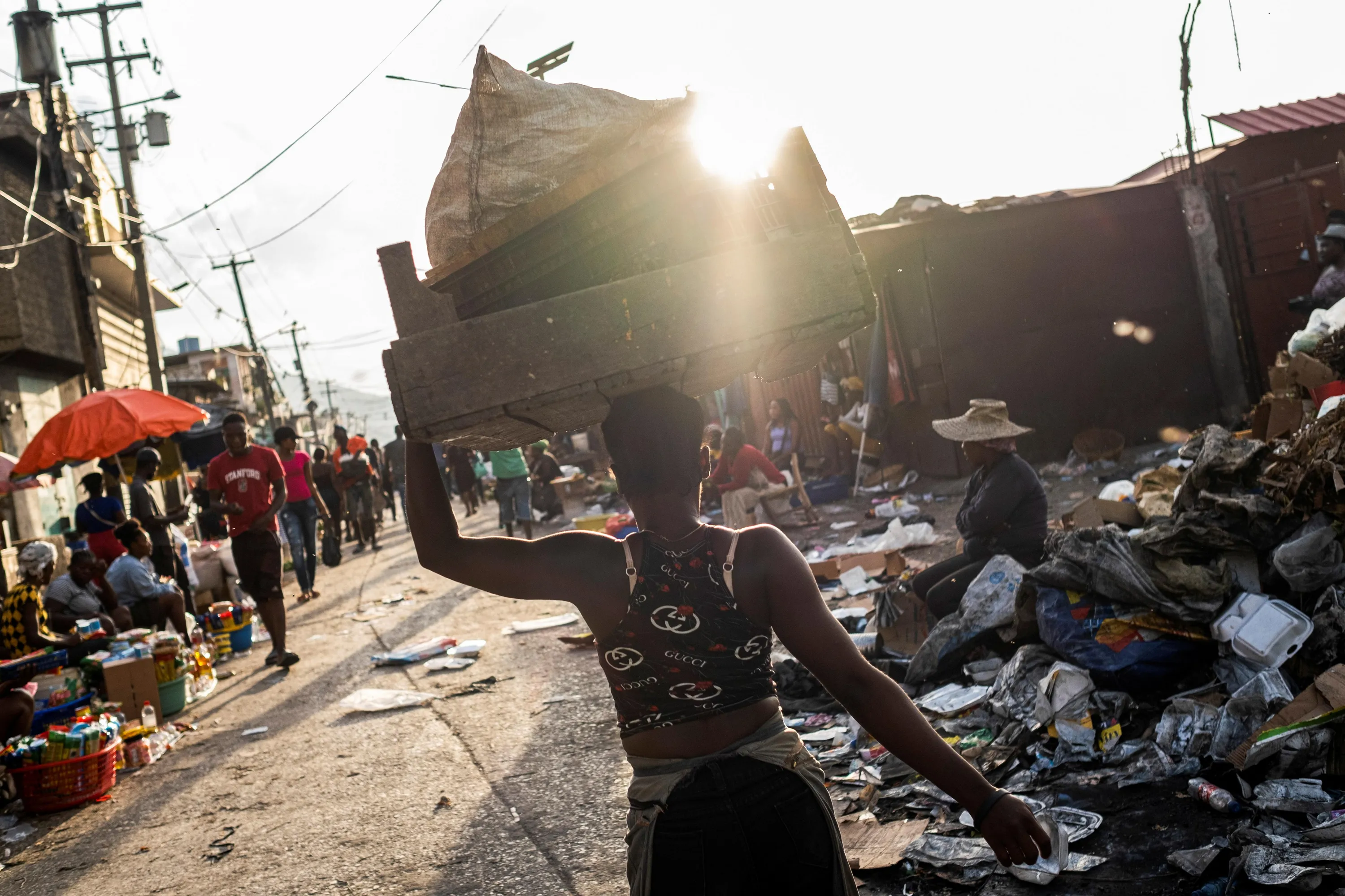 A woman carries merchandise over her head in a Petion-Ville street market in Port-au-Prince, Haiti on July 18, 2021. (Photo by Ricardo Arduengo/Reuters)