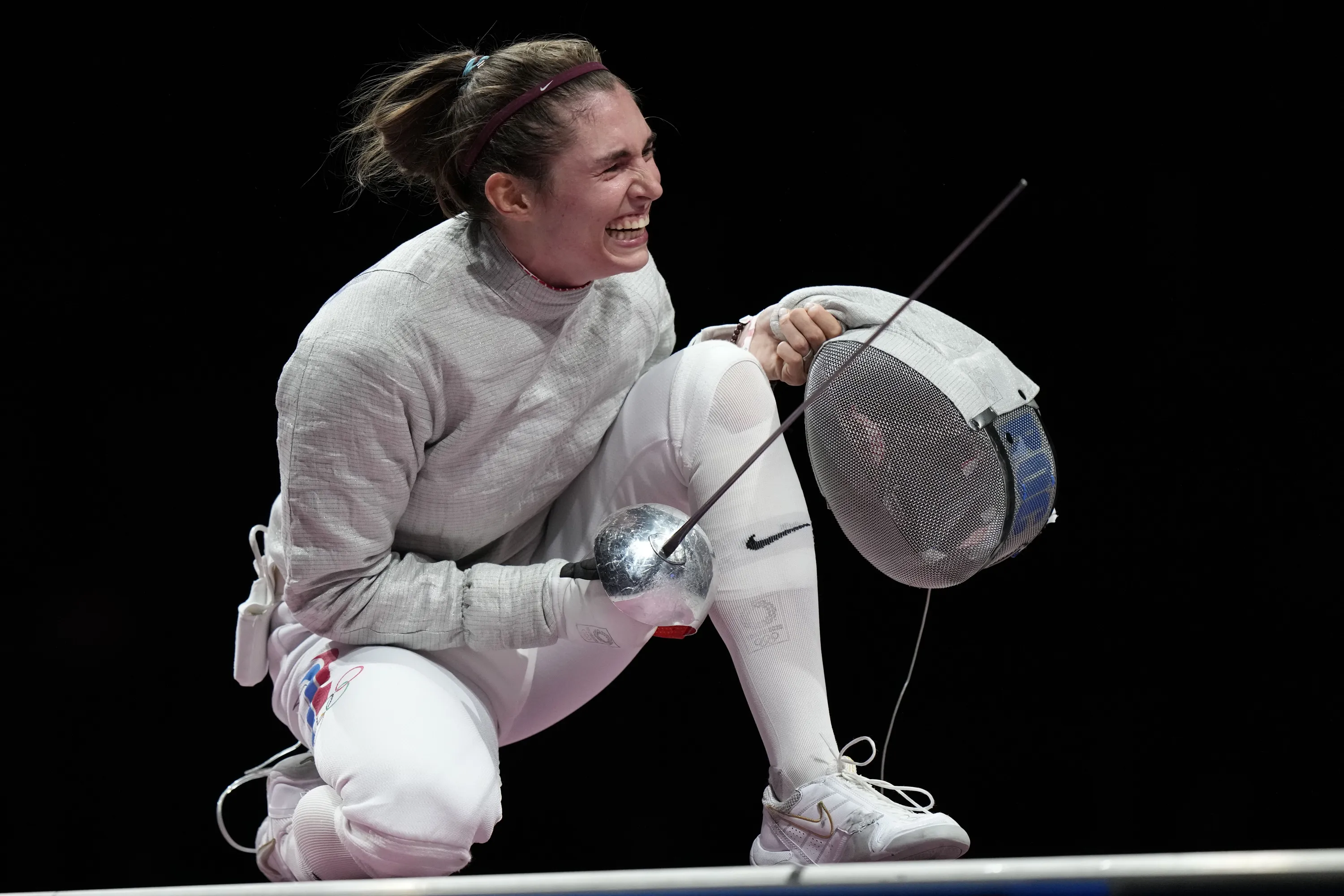 Sofia Pozdniakova celebrates after the gold at the women's individual Sabre final competition at the 2020 Summer Olympics, Monday, July 26, 2021, in Chiba, Japan. (Photo by Andrew Medichini/AP Photo)