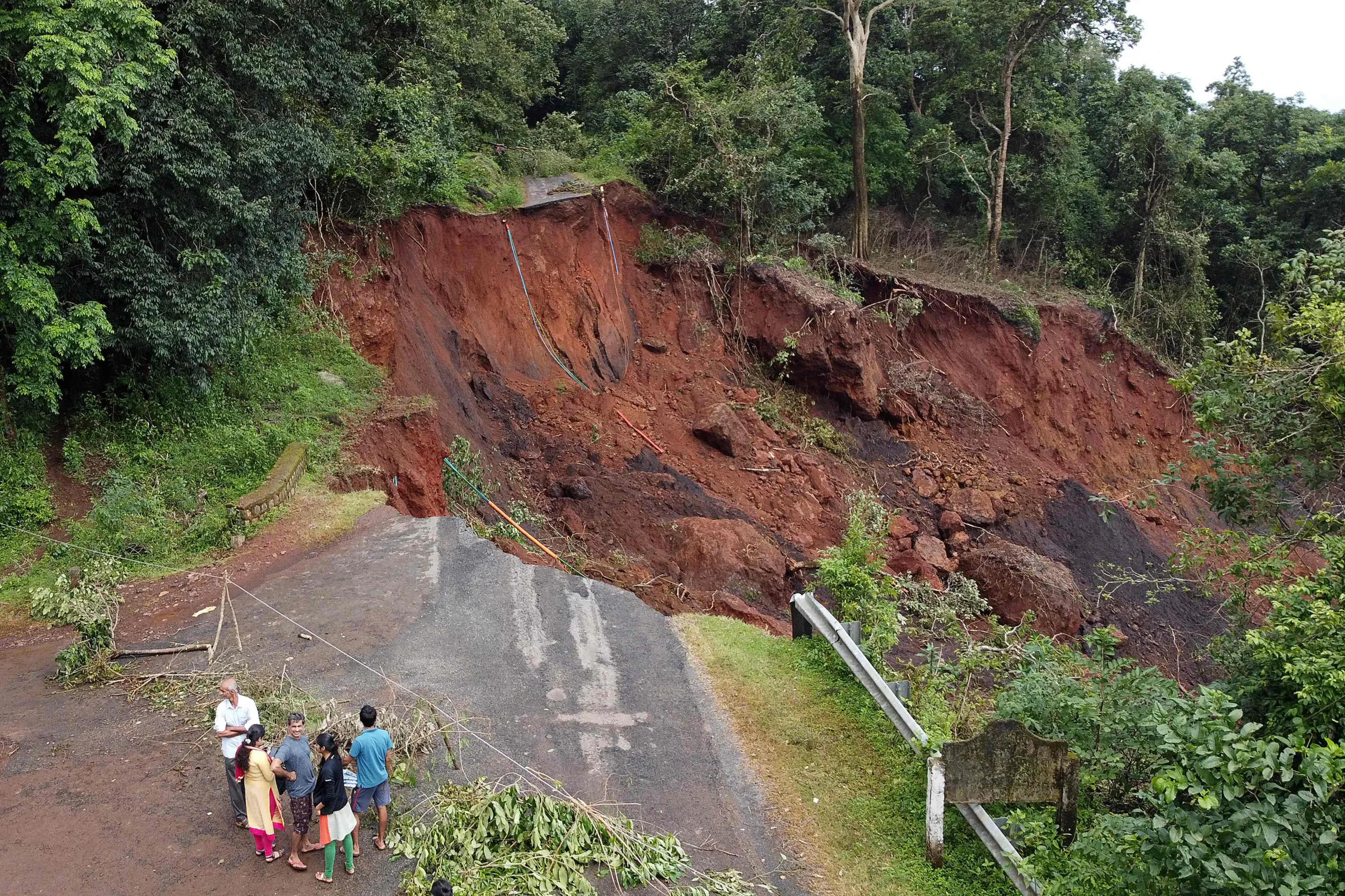 In this picture taken on July 26, 2021, onlookers gather near the site of a landslide due to ongoing heavy monsoon rains at Yellapur in the Uttara Kannada district of Karnataka. (Photo by Gopalkrishna Upadhyaya/AFP Photo)