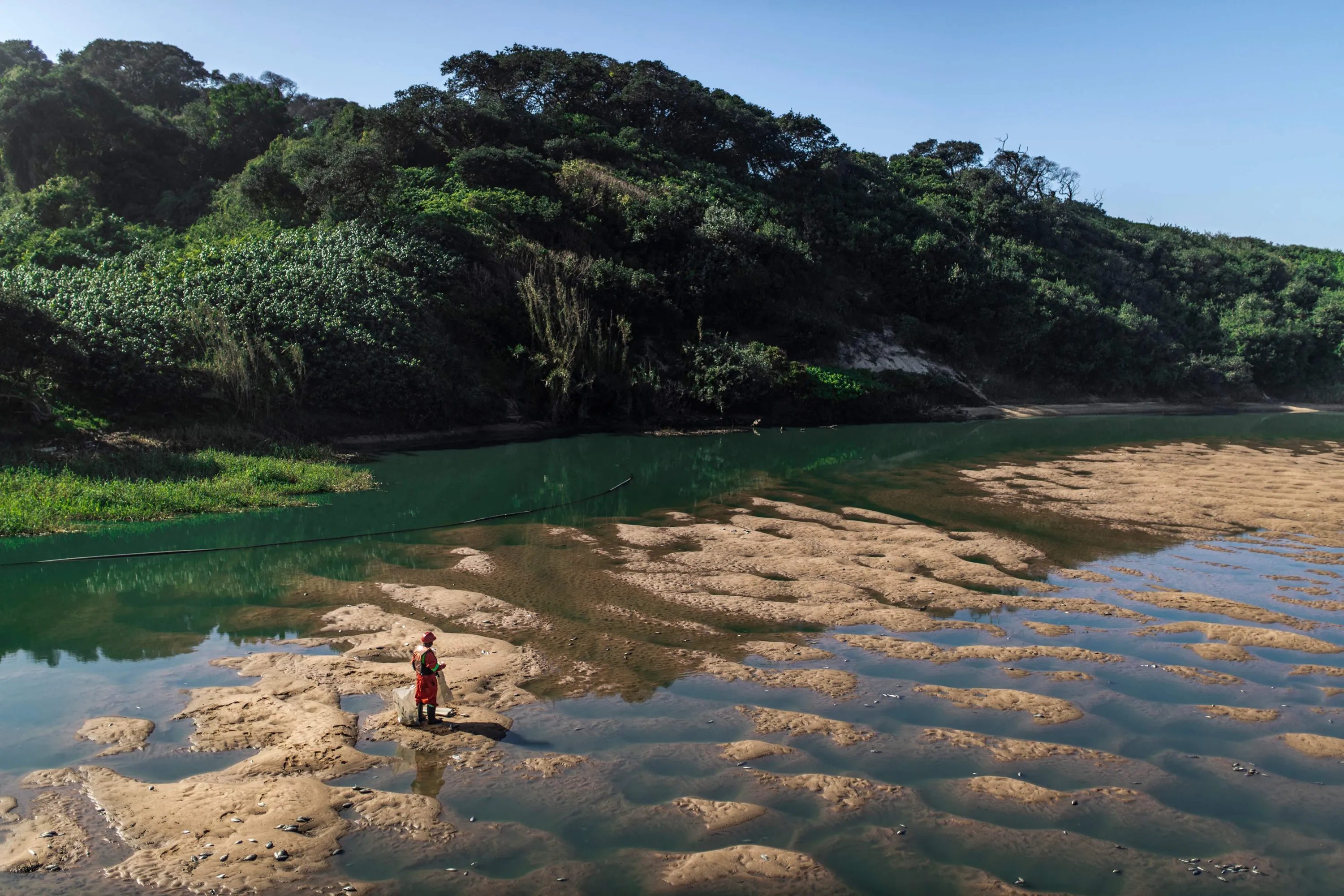 A member of a spill cleaning crew removes dead fish from the river in the uMhlanga Lagoon Nature Reserve in Durban on July 18, 2021. South African authorities said on July 17, 2021, they were investigating possible pollution suspected to be linked to a spill at a chemical plant attacked during last week's riots after dead fish washed ashore. The spill was identified on July 15, after an agrochemical warehouse near the eastern port city of Durban storing chemicals used for making herbicides, pesticides and fungicides was set ablaze . African authorities are investigating possible pollution suspected to be linked to a spill at a chemical plant attacked during recent riots in area. The agrochemical warehouse which stores chemicals used for making herbicides, pesticides and fungicides was set ablaze during the unrest that started last week. (Photo by Guillem Sartorio/AFP Photo)