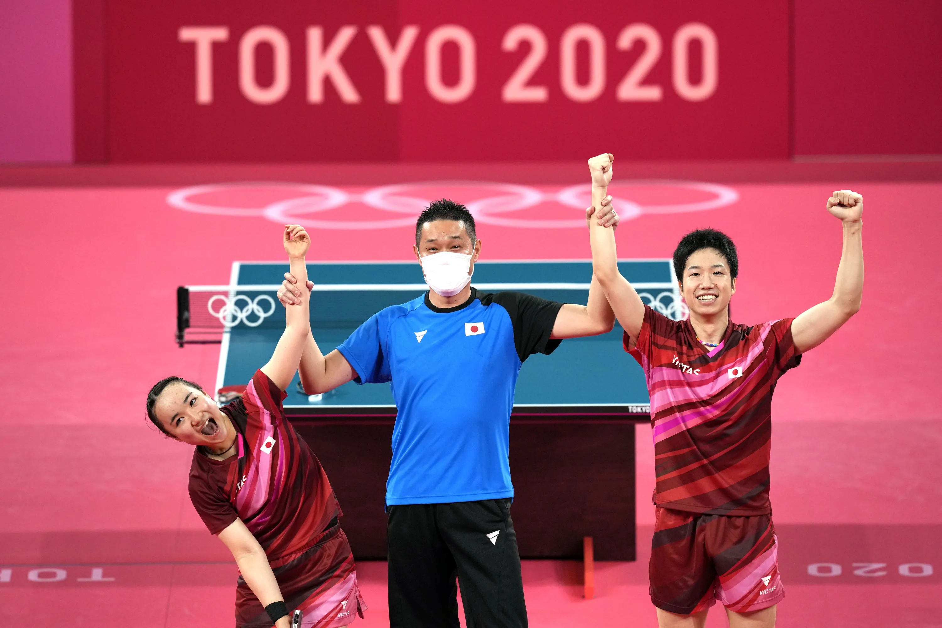 Japan's Mima Ito, left, and Jun Mizutani celebrate after winning the table tennis mixed doubles gold medal match against China's Xu Xin and Liu Shiwen at the 2020 Summer Olympics, Monday, July 26, 2021, in Tokyo. (Photo by Kin Cheung/AP Photo)