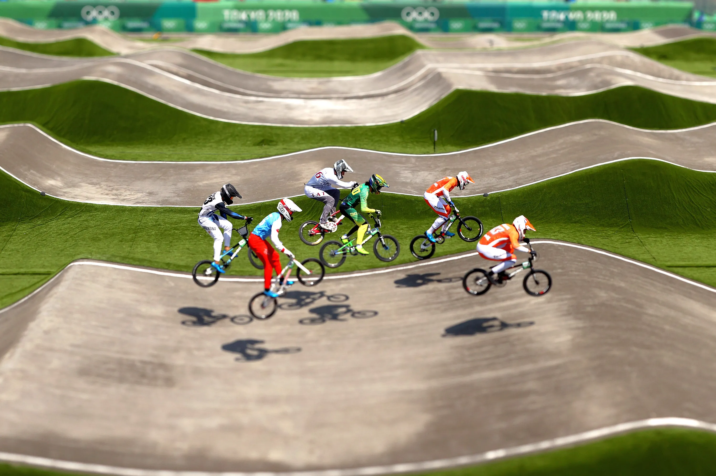 A general view of Niek Kimmann of Team Netherlands, James Palmer of Team Canada, Nicolas Torres of Team Argentina, Renato Rezende of Team Brazil, Helvijs Babris of Team Latvia and Twan van Gendt of Team Netherlands as they jump during the Men's BMX quarterfinal heat 2, run 2 on day six of the Tokyo 2020 Olympic Games at Ariake Urban Sports Park on July 29, 2021 in Tokyo, Japan. (Photo by Ezra Shaw/Getty Images)