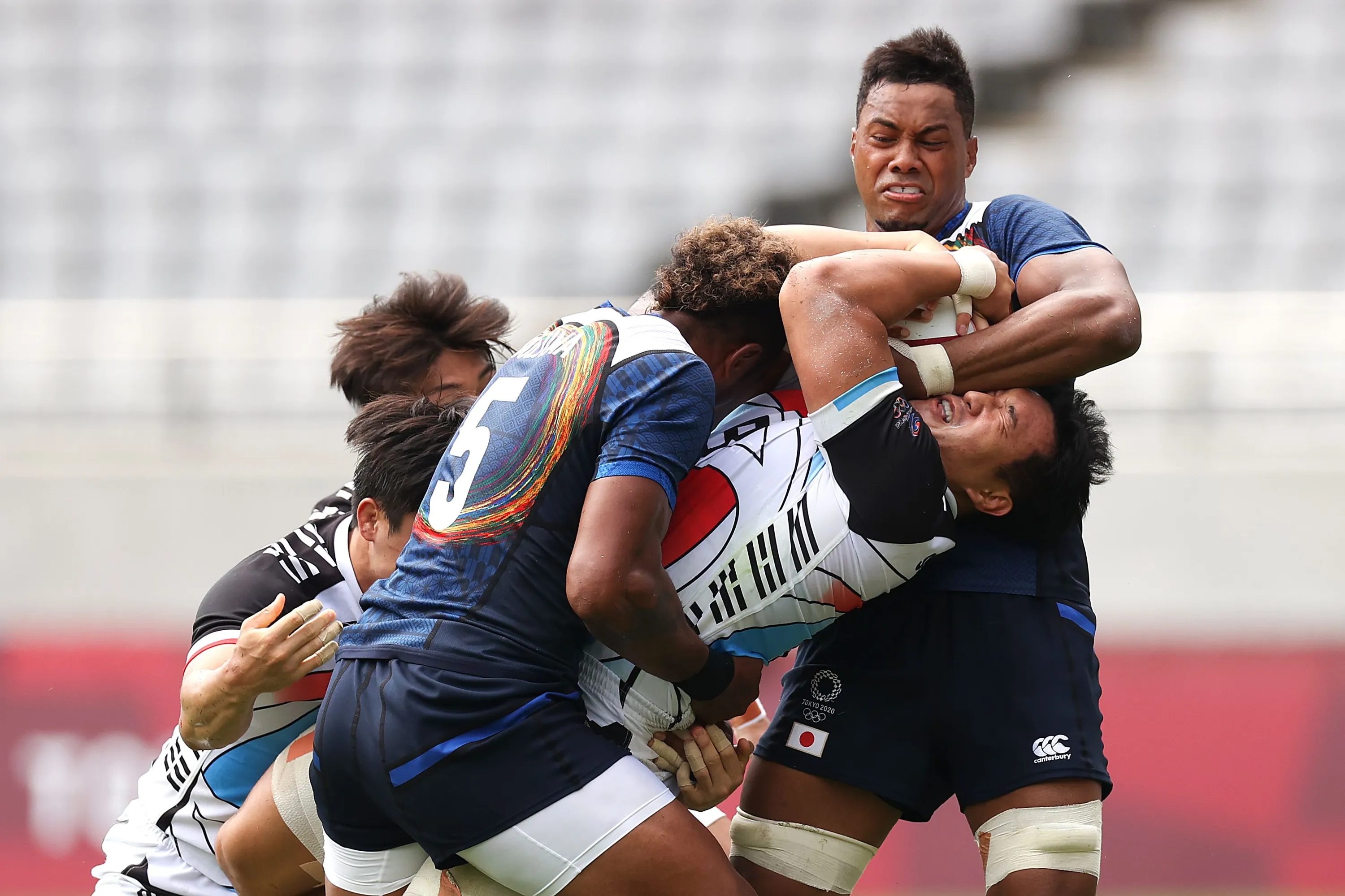 Seongmin Jang of Team South Korea is tackled by Kameli Raravou Latianara Soejima and Jose Seru of Team Japan during the Rugby Sevens Men's Placing 11-12 match between South Korea and Japan on day five of the Tokyo 2020 Olympic Games at Tokyo Stadium on July 28, 2021 in Chofu, Tokyo, Japan. (Photo by Dan Mullan/Getty Images)
