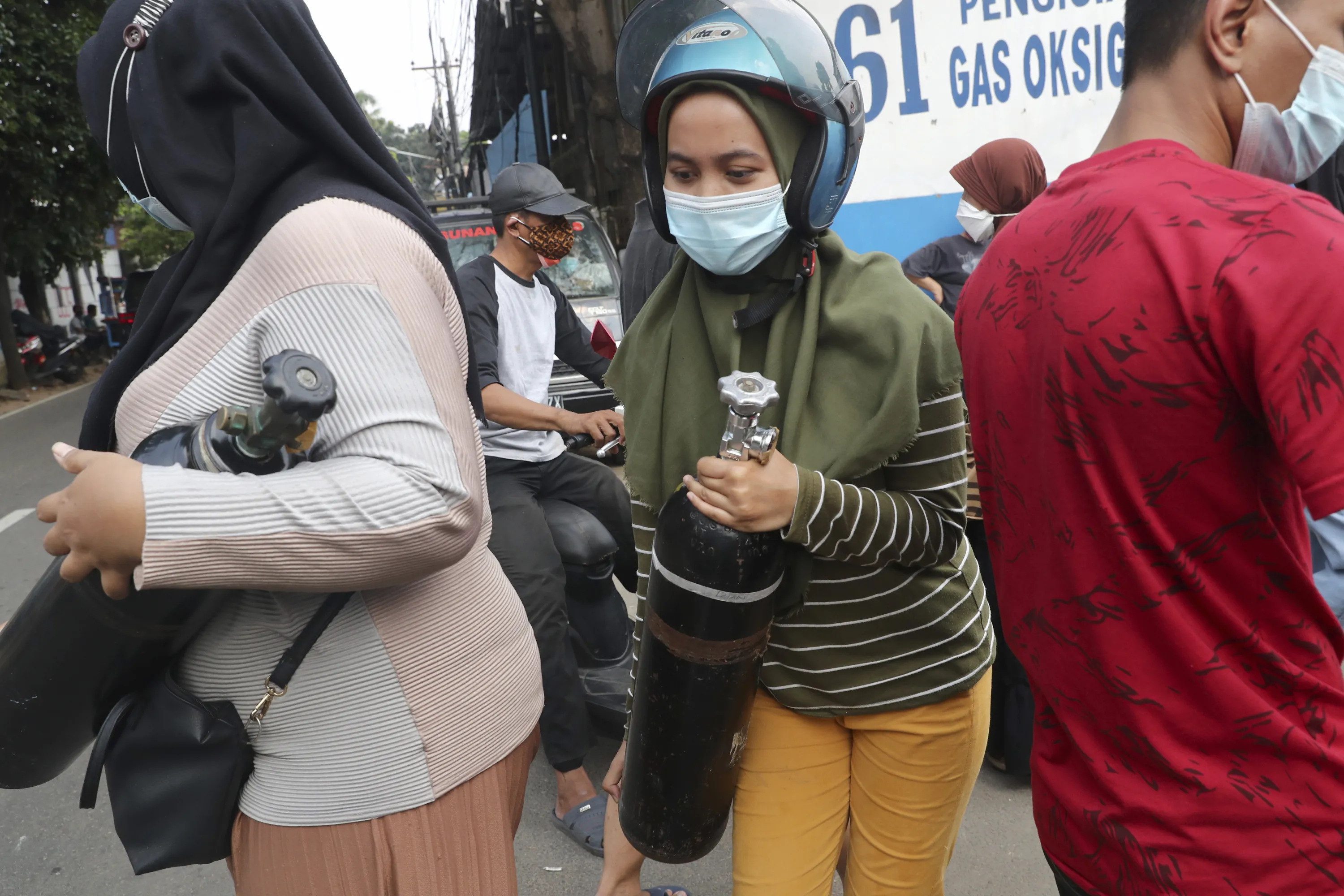 A woman carries her oxygen tank after having it refilled at a recharging station in Jakarta, Indonesia, Friday, July 9, 2021. The world's fourth most populous country is running out of oxygen as it endures a devastating wave of coronavirus cases and the government is seeking emergency supplies from other countries, including Singapore and China. (Photo by Tatan Syuflana/AP Photo)