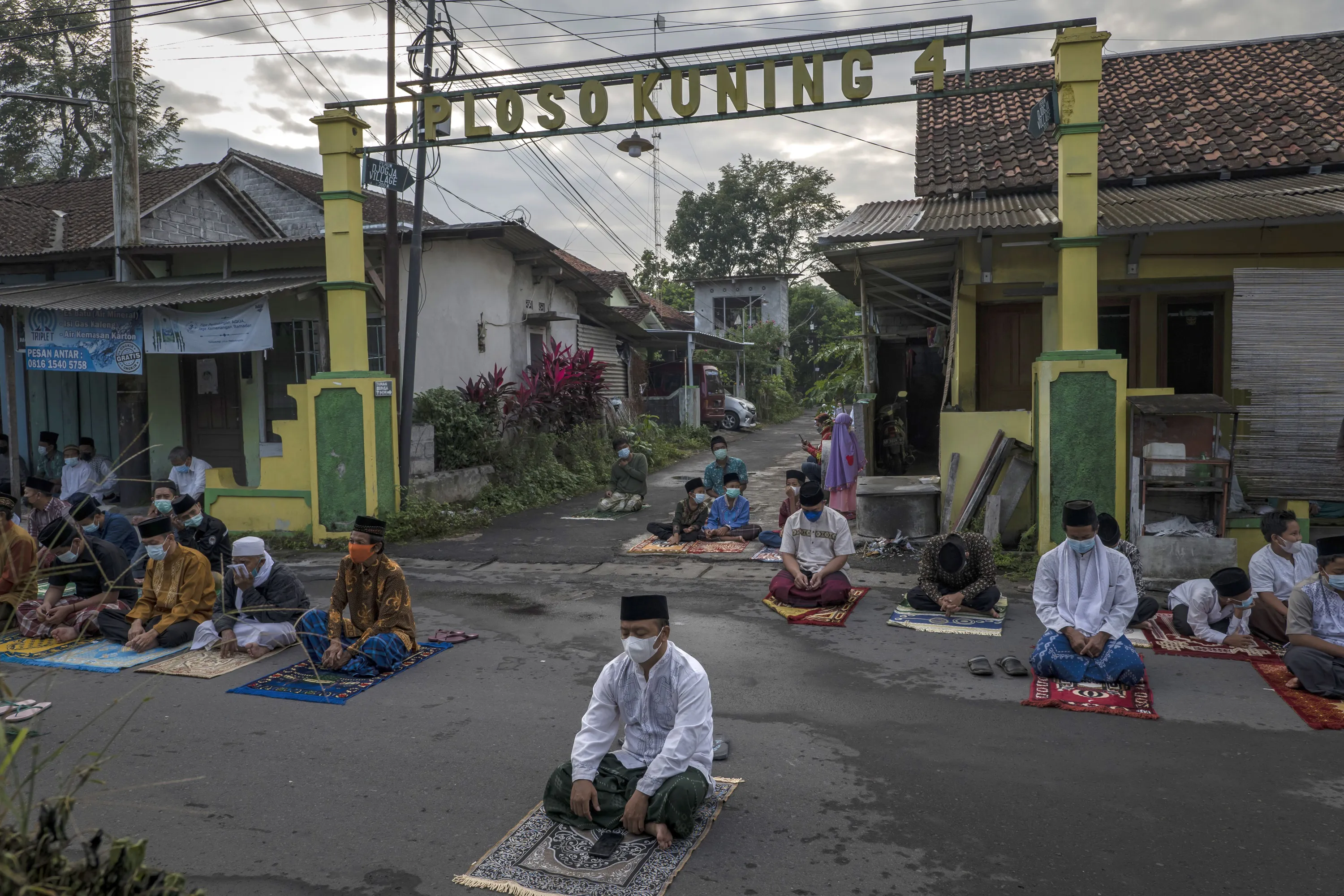 Indonesian Muslims attend as they perform Eid Al-Adha prayer as Indonesia imposed emergency restrictions on July 20, 2021 in Yogyakarta, Indonesia. Muslims worldwide celebrate Eid Al-Adha, to commemorate the Prophet Ibrahim's readiness to sacrifice his son as a sign of his obedience to God, during which they sacrifice permissible animals, generally goats, sheep, and cows. (Photo by Ulet Ifansasti/Getty Images)