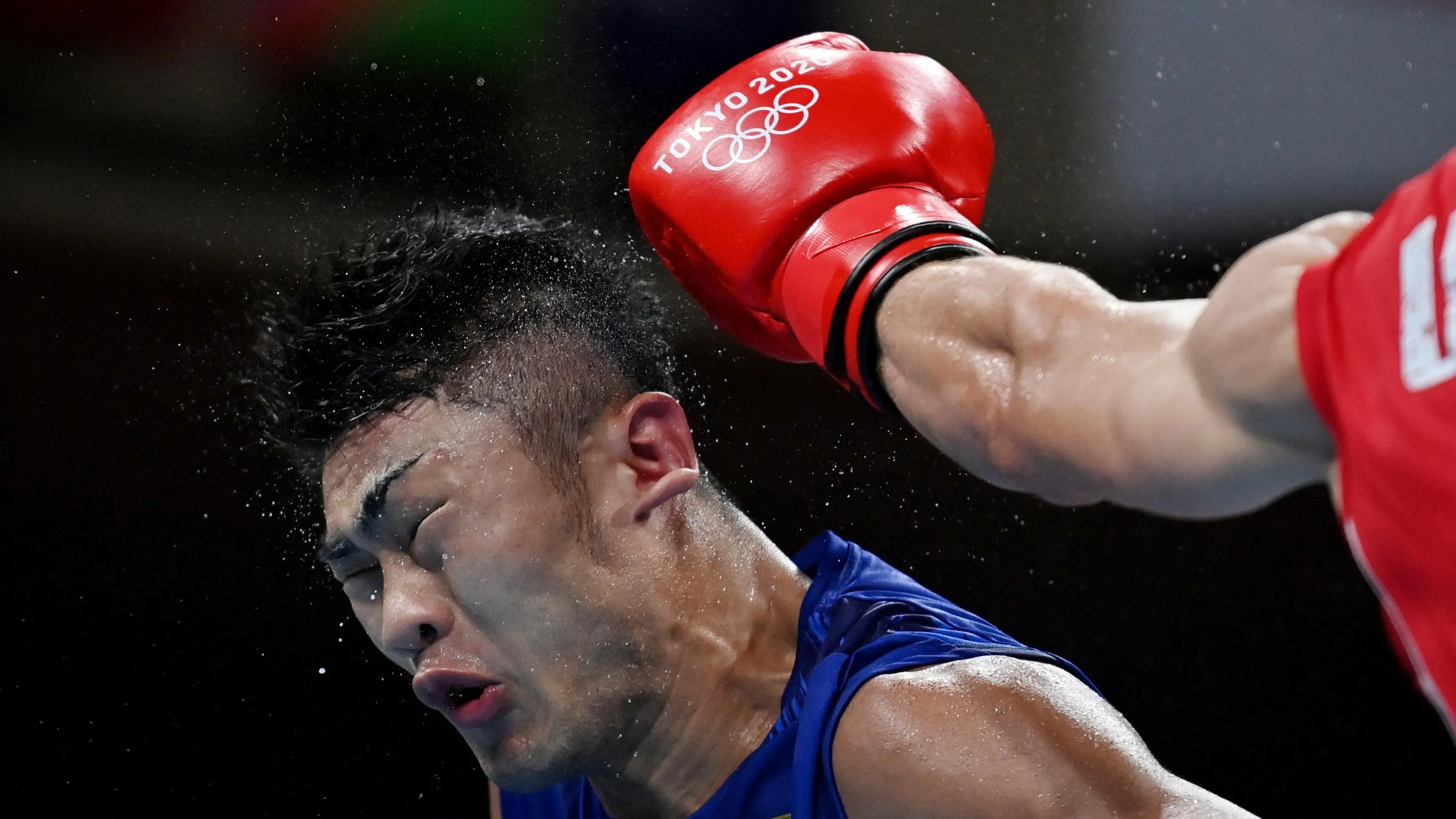 Yuito Moriwaki from Japan and Oleksandr Khyzhniak from Ukraine during pre final boxing knock out rounds at Kokugikan arena at the Tokyo Olympics, Tokyo, Japan on July 28, 2021. (Photo by Luis Robayo/Pool via Reuters)