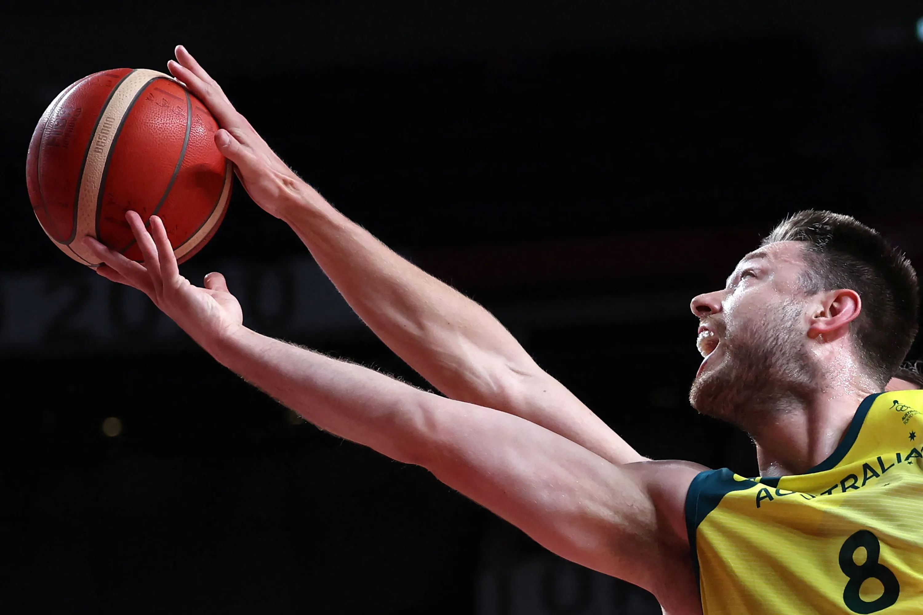 Australia's Matthew Dellavedova goes to the basket in the men's preliminary round group B basketball match between Australia and Germany during the Tokyo 2020 Olympic Games at the Saitama Super Arena in Saitama on July 31, 2021. (Photo by Thomas Coex/AFP Photo)