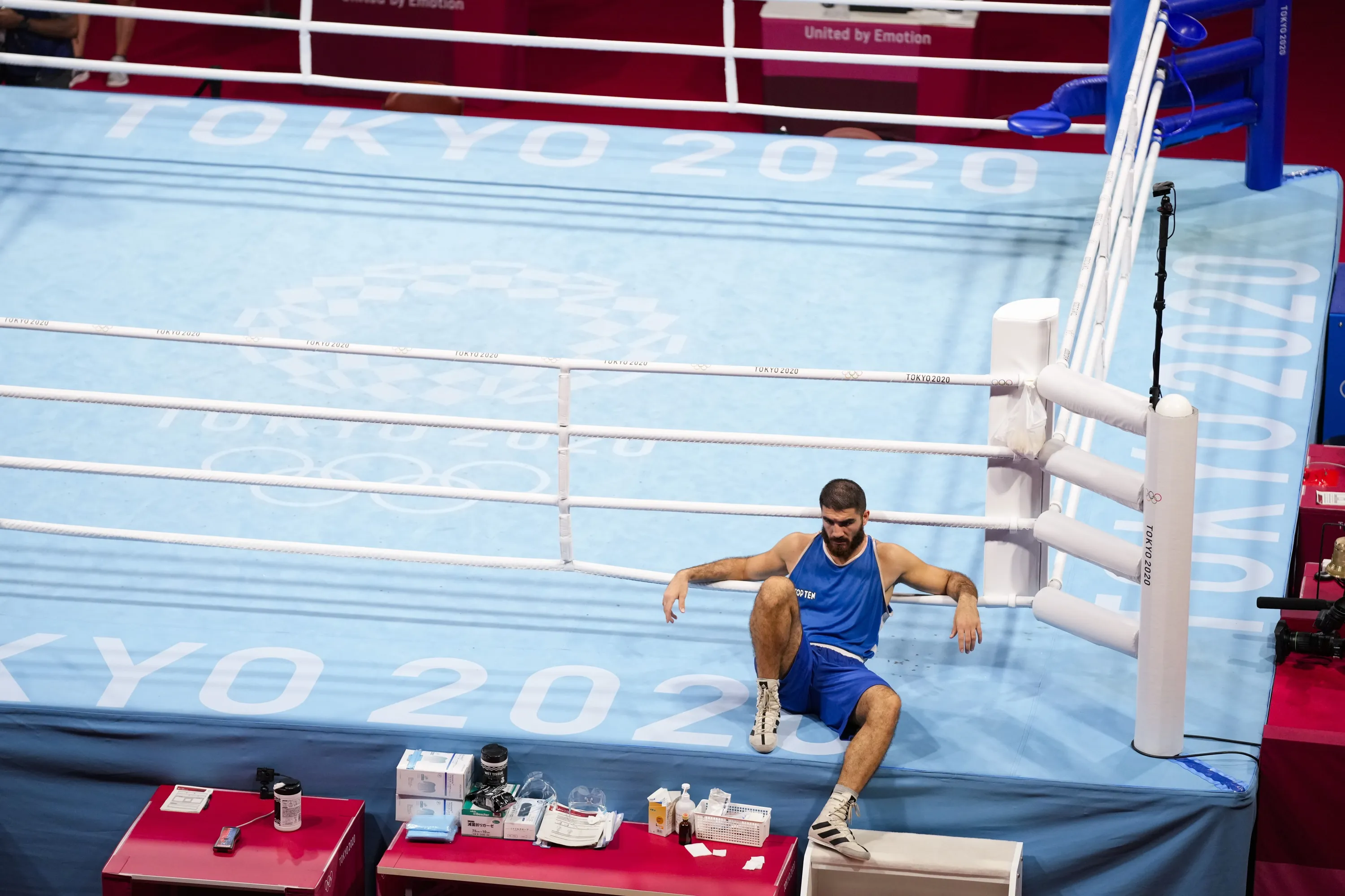 Eliad Mourad, of France refuses to leave the ring after losing a men's super heavyweight over 91-kg boxing match against Britain's Frazer Clarke at the 2020 Summer Olympics, Sunday, August 1, 2021, in Tokyo, Japan. (Photo by Frank Franklin II/AP Photo)