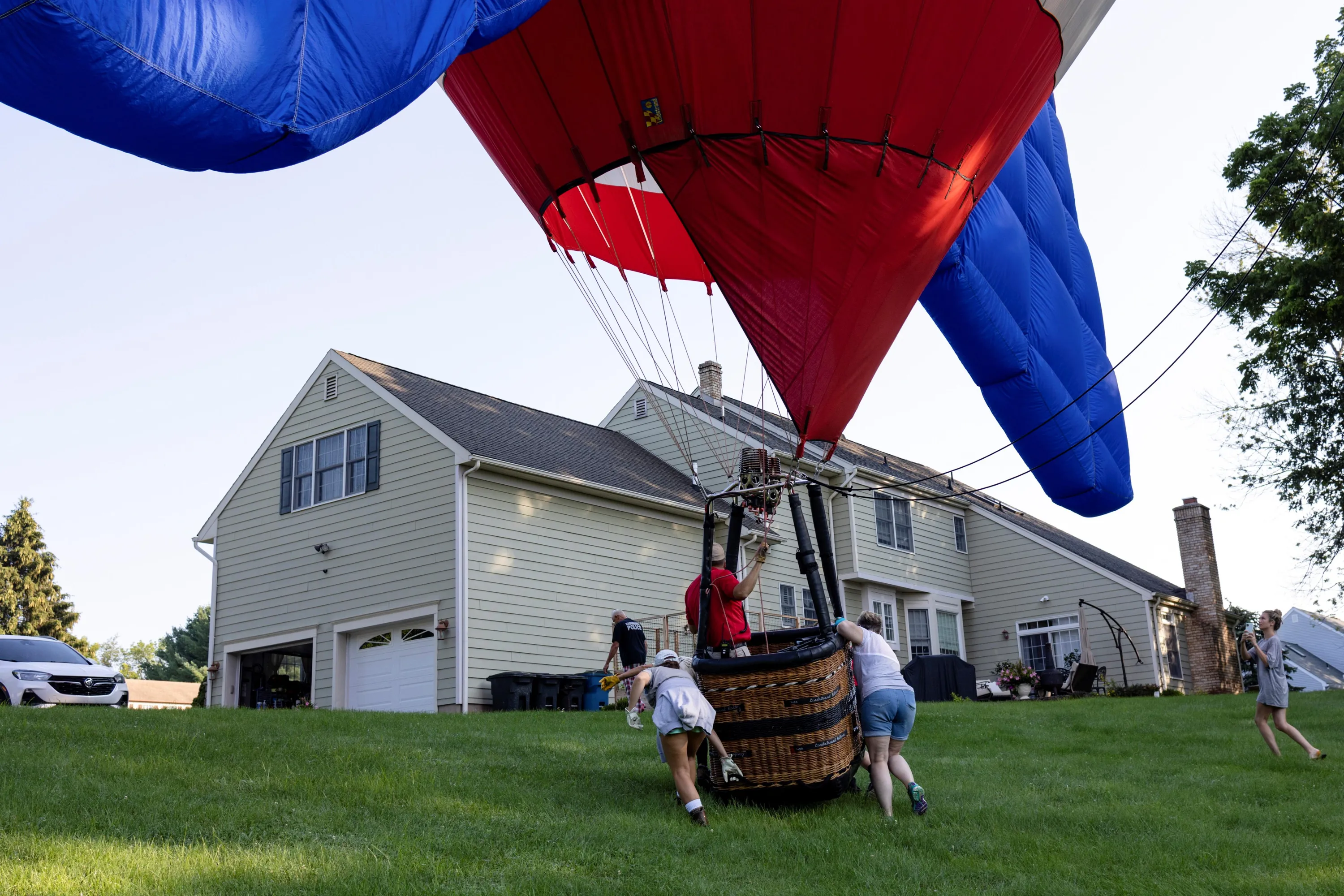 A hot air balloon lands in a residential area during the New Jersey Lottery Festival of Ballooning in Flemington, New Jersey, U.S., July 24, 2021. (Photo by Hannah Beier/Reuters)