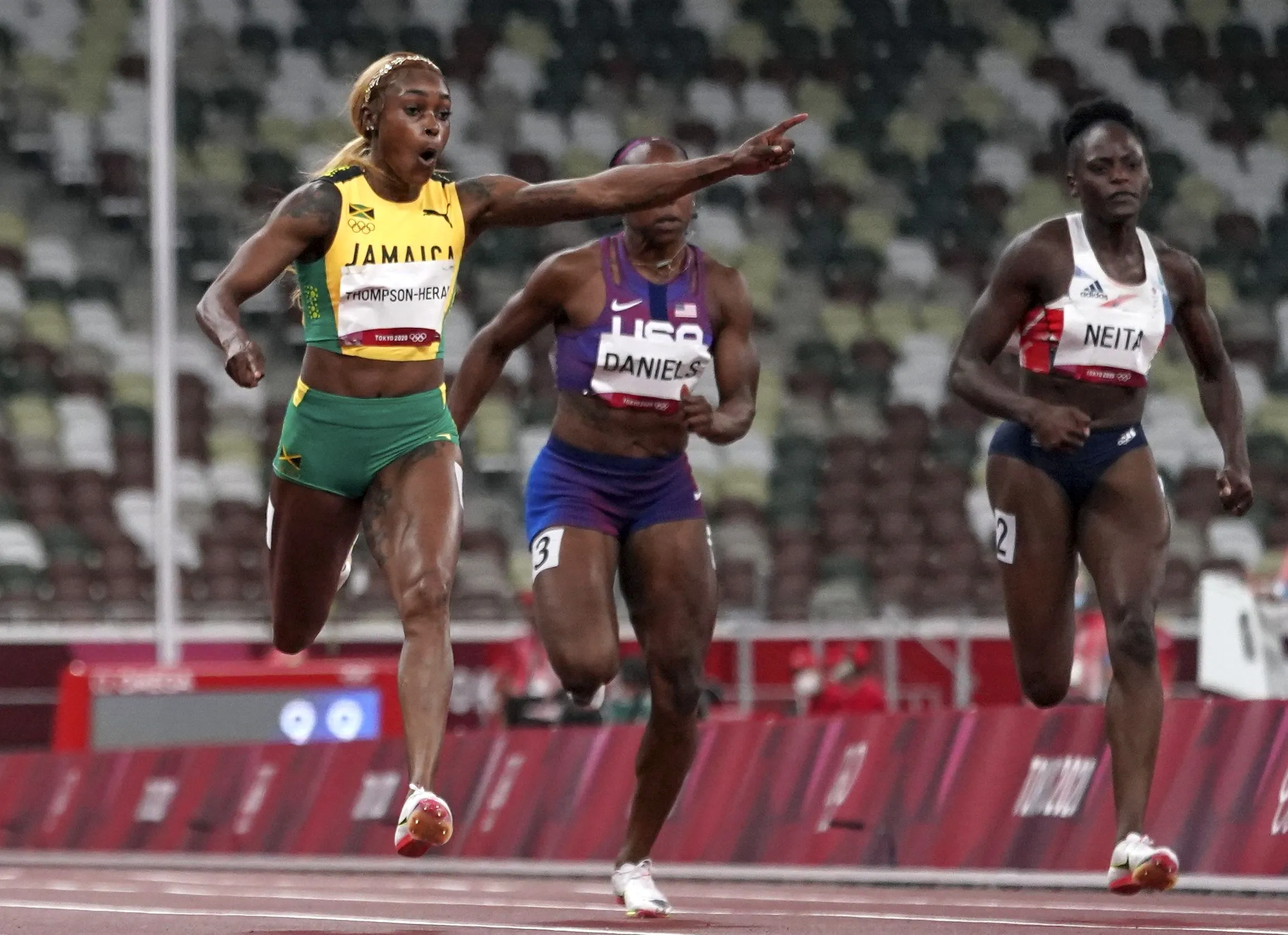 Elaine Thompson-Herah of Team Jamaica begins to celebrate as she crosses the finish line to win the Women's 100m Final during the Tokyo 2020 Olympic Games Athletics competition at Olympic Stadium on Saturday, July 31, 2021. (Photo by Toni L. Sandys/The Washington Post)