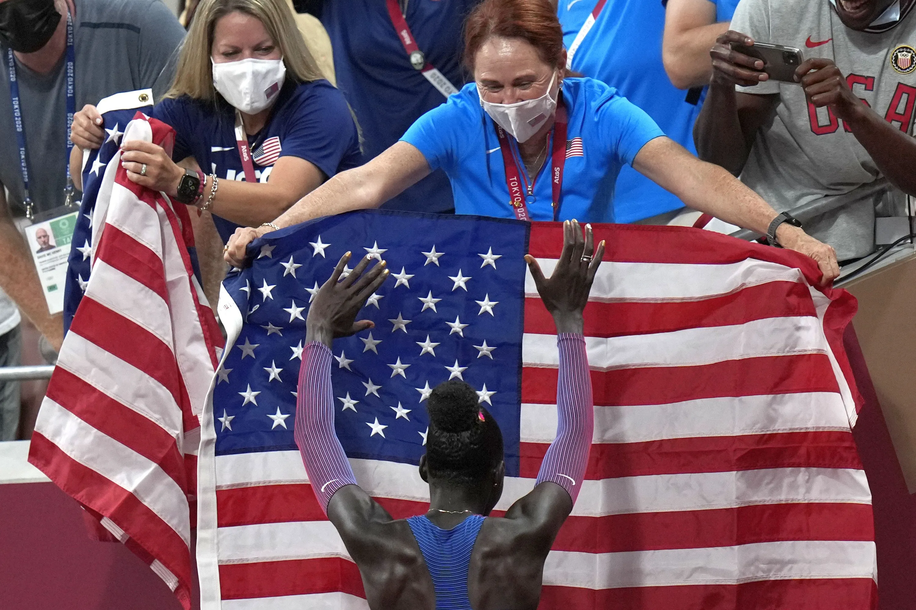 Athing Mu, of United States, celebrates after winning the final of the women's 800-meters at the 2020 Summer Olympics, Tuesday, August 3, 2021, in Tokyo. (Photo by Petr David Josek/AP Photo)
