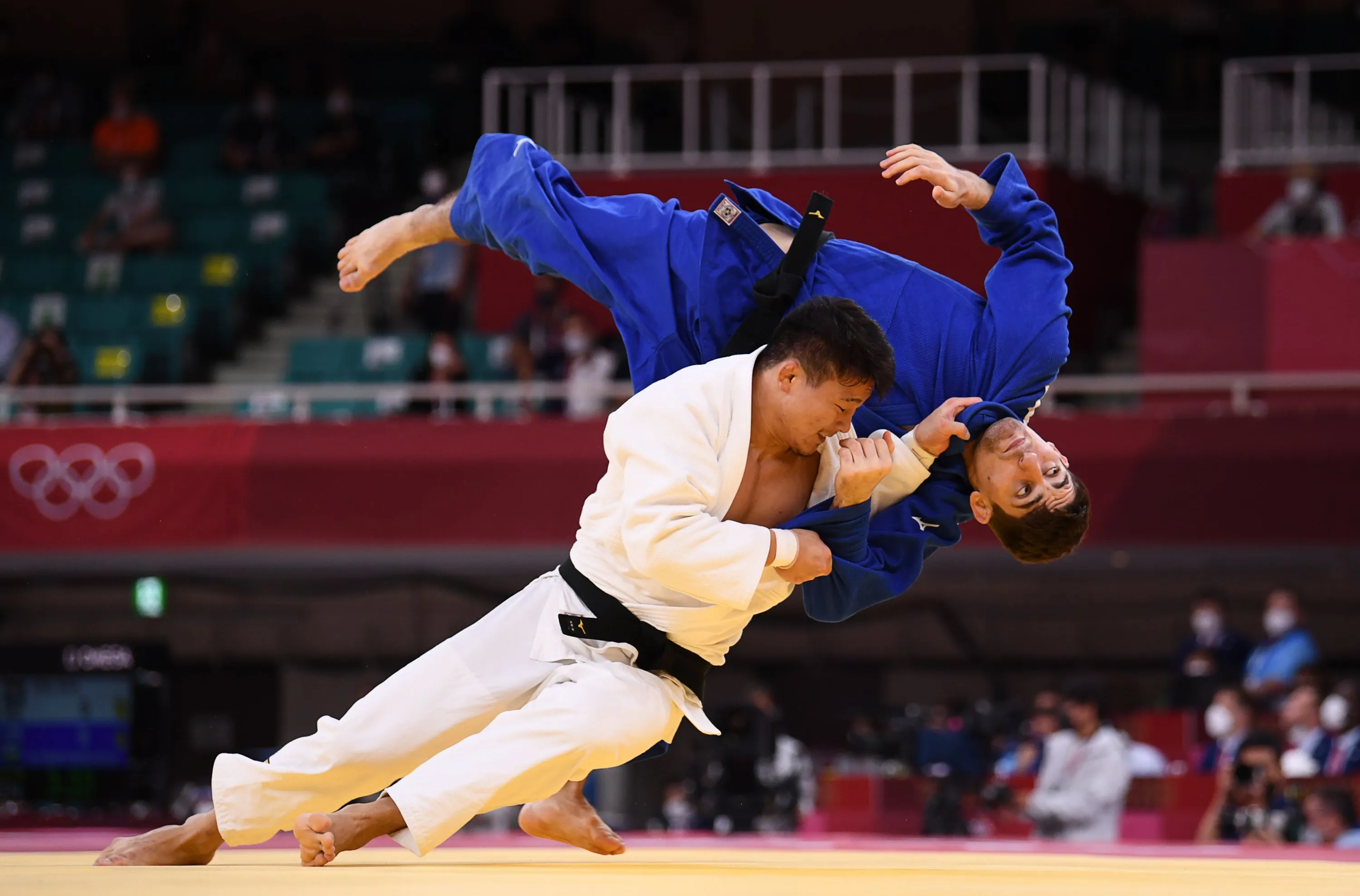 Shoichiro Mukai, of Japan, scores a point against Eduard Trippel, of Germany, during a mixed team judo quarterfinal at Nippon Budokan in Tokyo, Japan on July 31, 2021. (Photo by Annegret Hilse/Reuters)