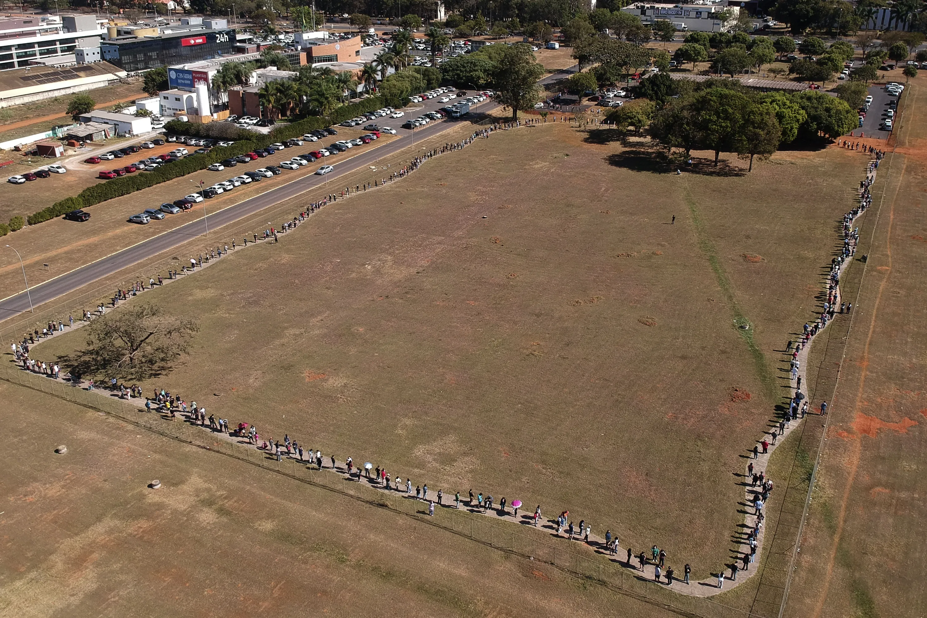 A line of people snakes around a field to enter a COVID-19 vaccination site, as people over age 30 became eligible for a vaccine in Brasilia, Brazil, Tuesday, August 3, 2021. (Photo by Eraldo Peres/AP Photo)