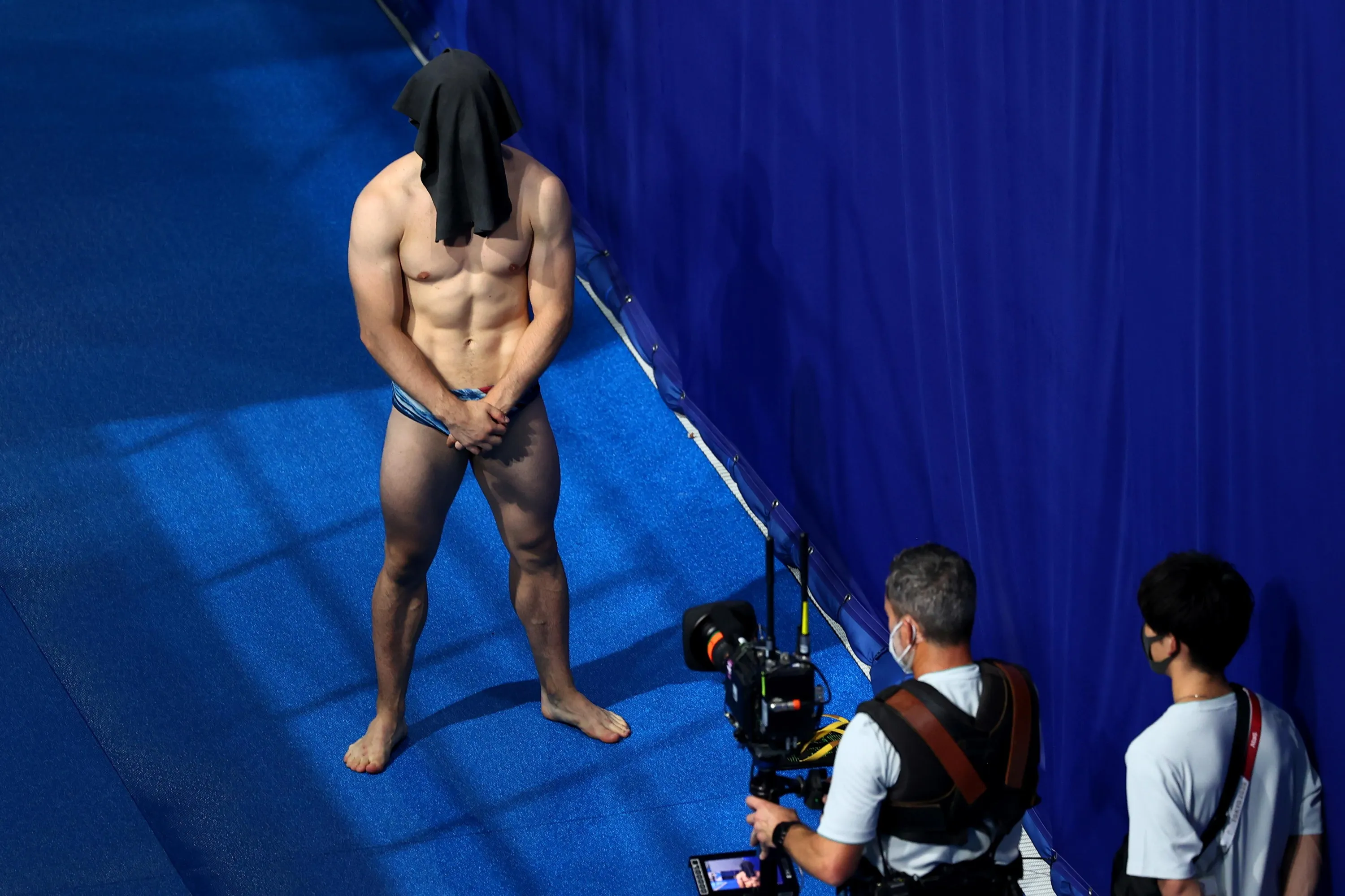 France's Alexis Jandard stands with a towel on his face during the preliminary round of the men's 3m springboard diving event during the Tokyo 2020 Olympic Games at the Tokyo Aquatics Centre in Tokyo on August 2, 2021. (Photo by Antonio Bronic/Reuters)