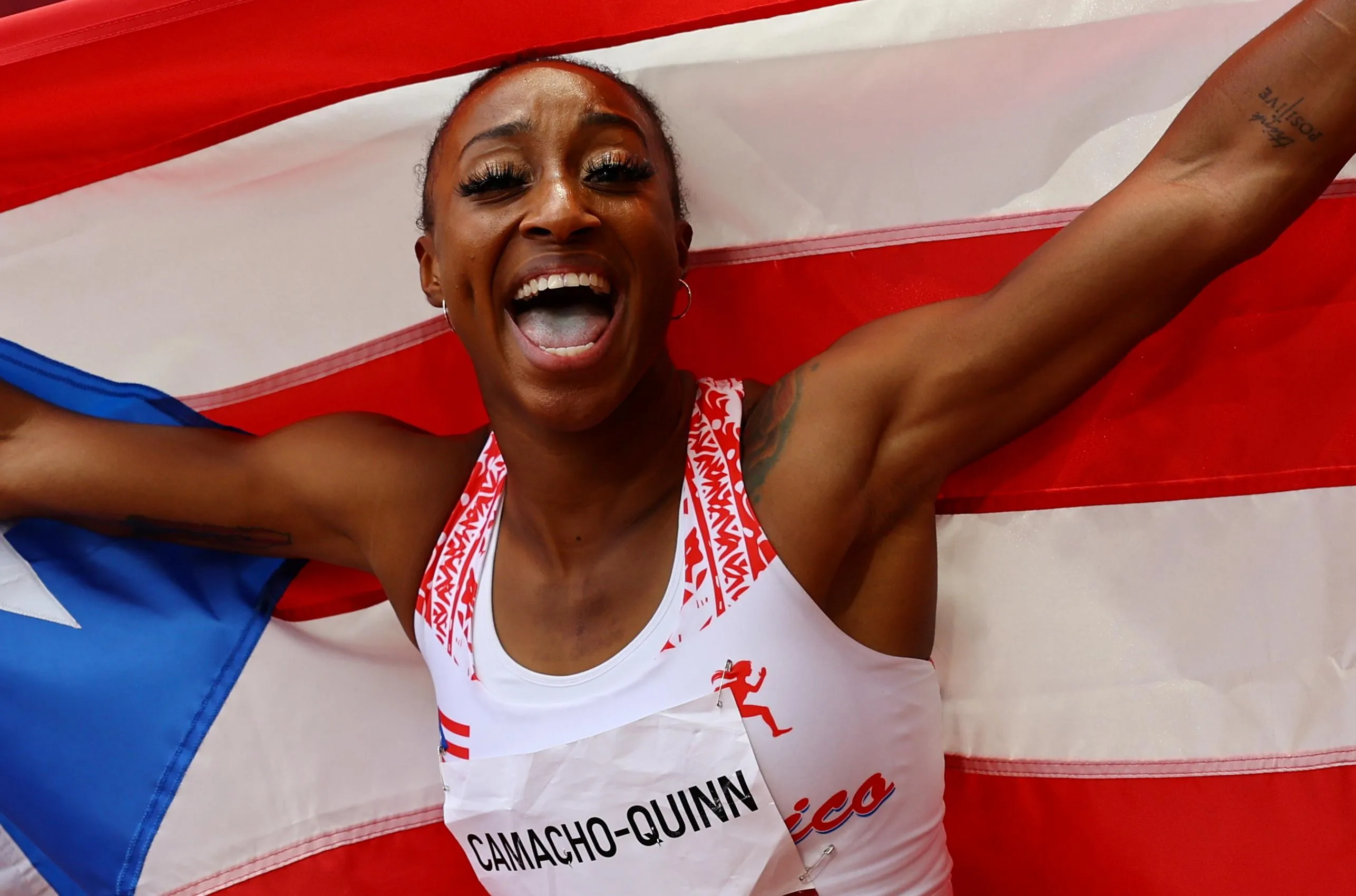 Jasmine Camacho-Quinn of Puerto Rico celebrates after winning gold in the women's 100-meter hurdles final at the Tokyo Olympics on August 2, 2021, at the National Stadium in Tokyo. (Photo by Kai Pfaffenbach/Reuters)