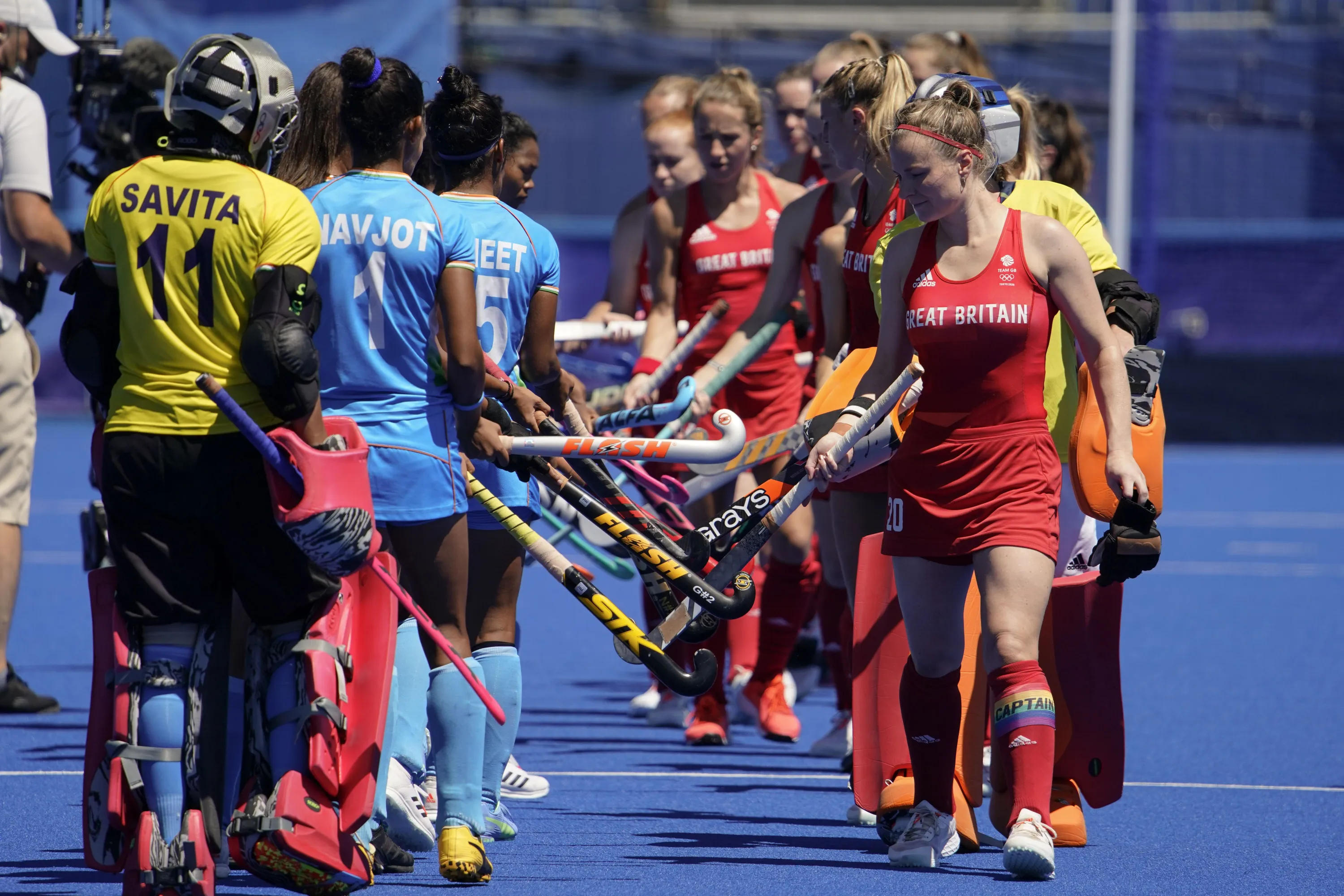 Members of the India team, left, greet members of the Britain team prior to their women's field hockey bronze medal match at the 2020 Summer Olympics, Friday, August 6, 2021, in Tokyo, Japan. (Photo by John Locher/AP Photo)