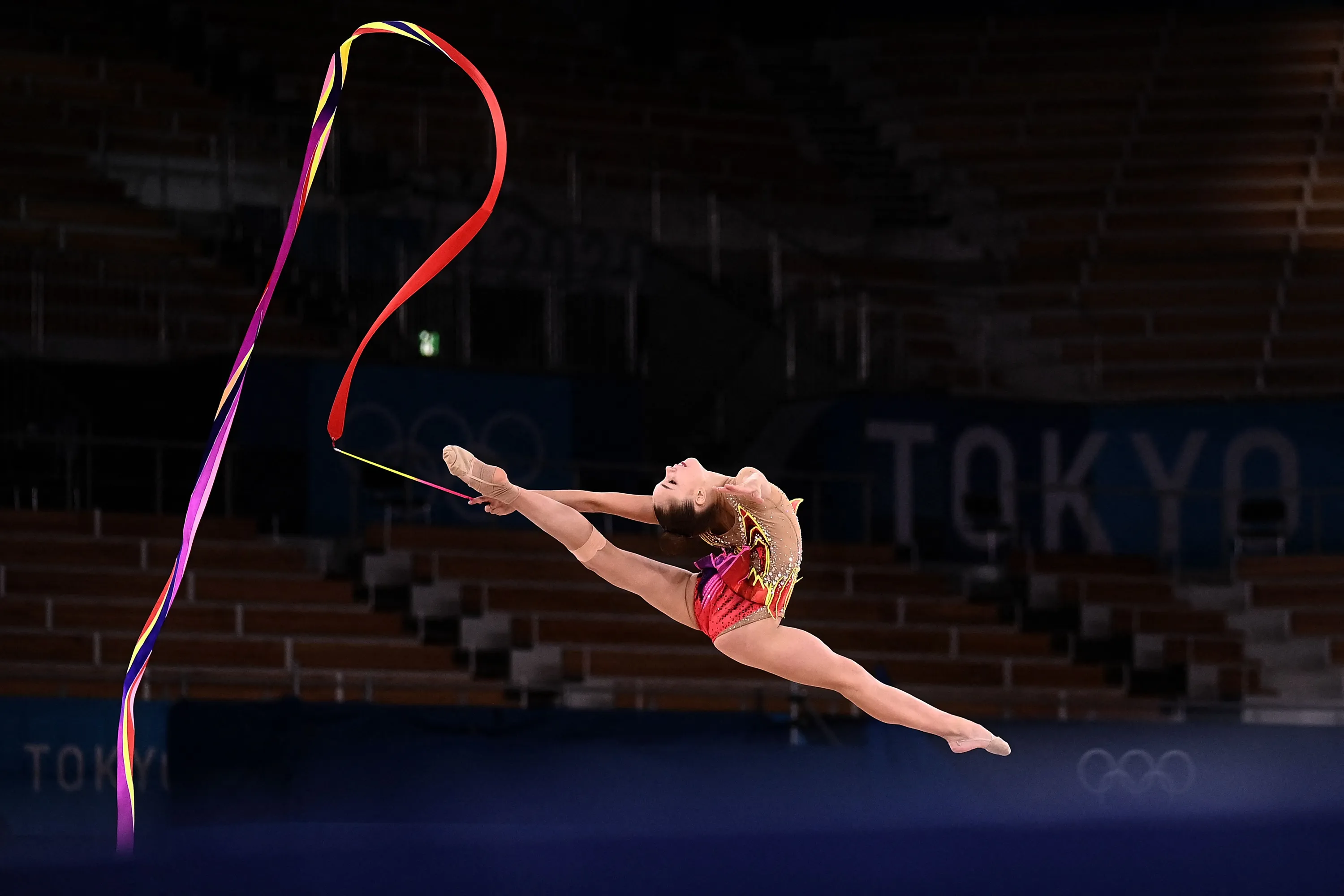 Belarus' Anastasiia Salos competes in the individual all-around qualification of the Rhythmic Gymnastics event during Tokyo 2020 Olympic Games at Ariake Gymnastics centre in Tokyo, on August 6, 2021. (Photo by Lionel Bonaventure/AFP Photo)