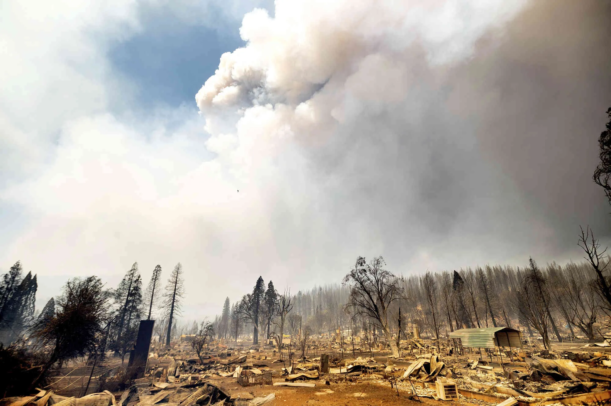 This photo shows homes destroyed by the Dixie Fire line central Greenville on Thursday, August 5, 2021, in Plumas County, Calif. (Photo by Noah Berger/AP Photo)